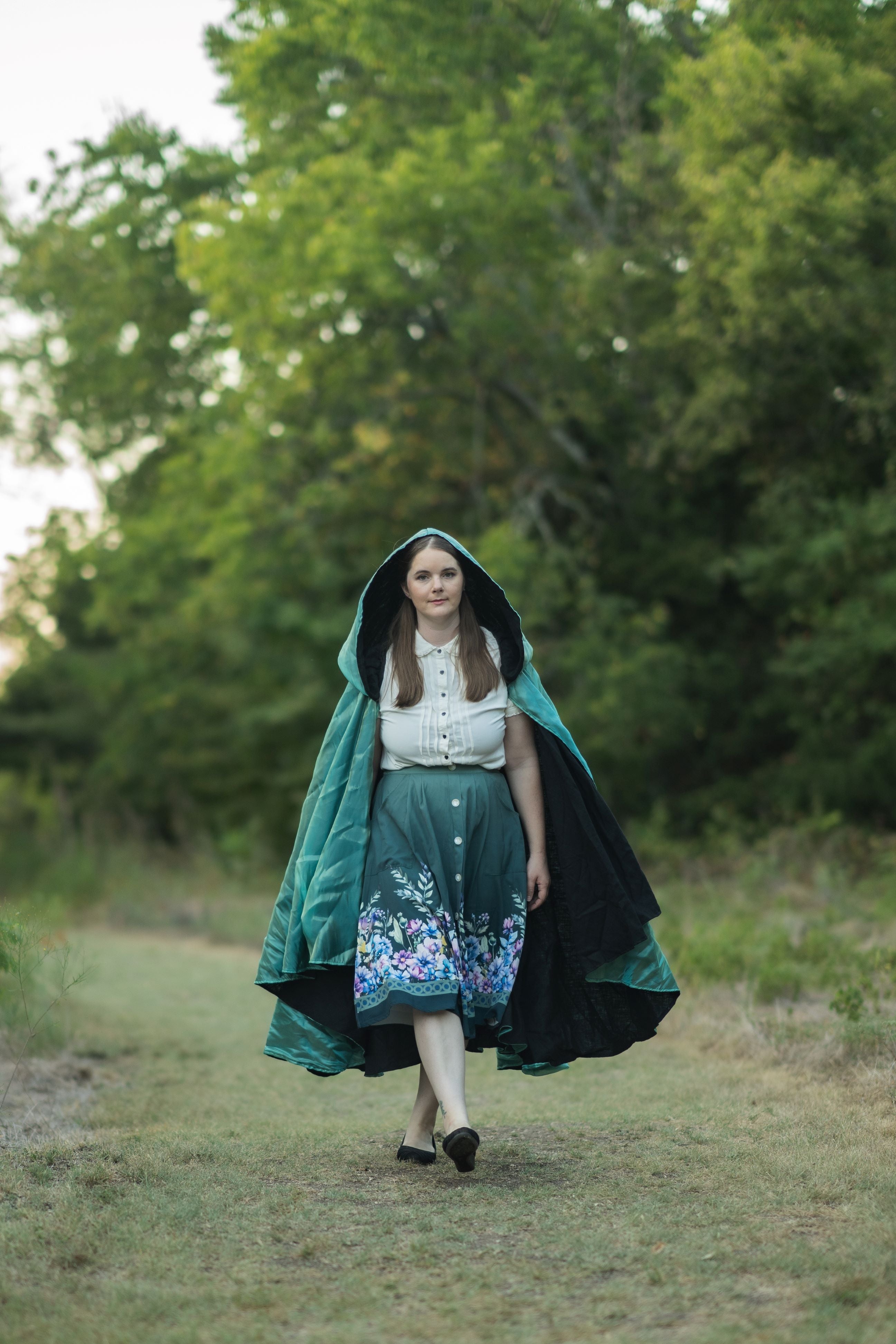 See MoreA delightfully full cloak with a high low hemline- fully reversible with a dramatically large hood.