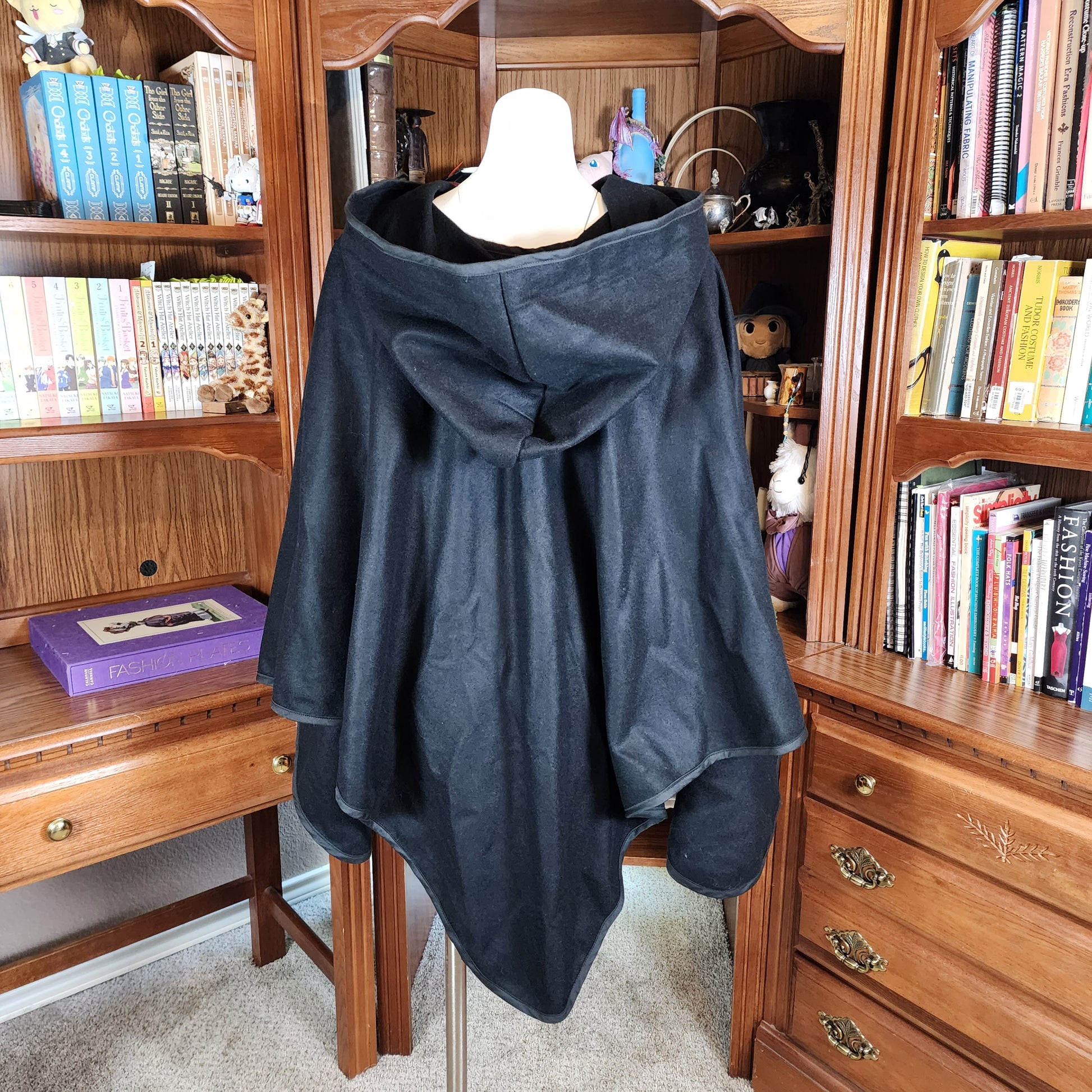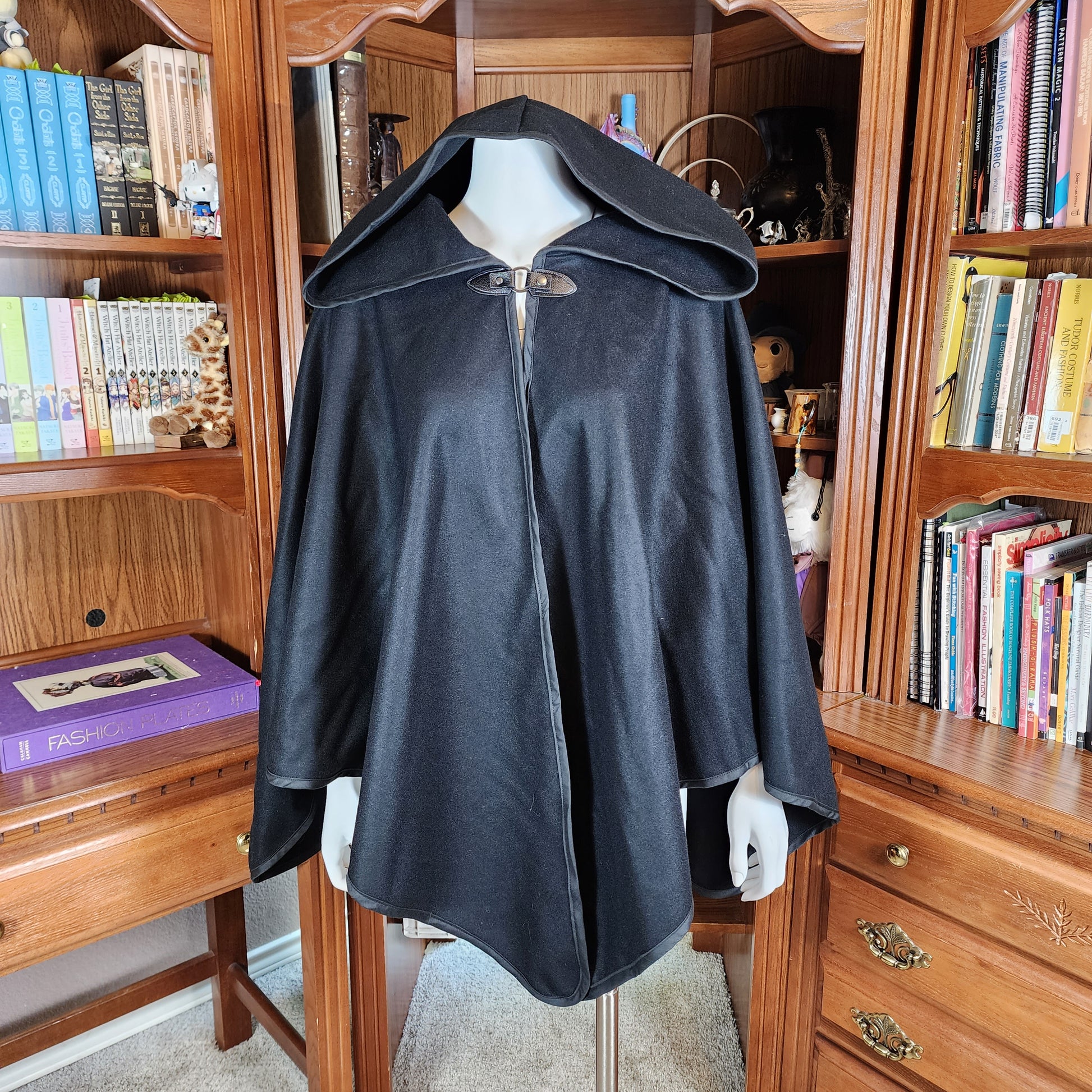 A simple cloak made from a medium weight wool and rayon blend Melton fabric. The Apprentice Adventurer cloaks have a deep hood and a pointed hemline, with a leather snap style clasp.