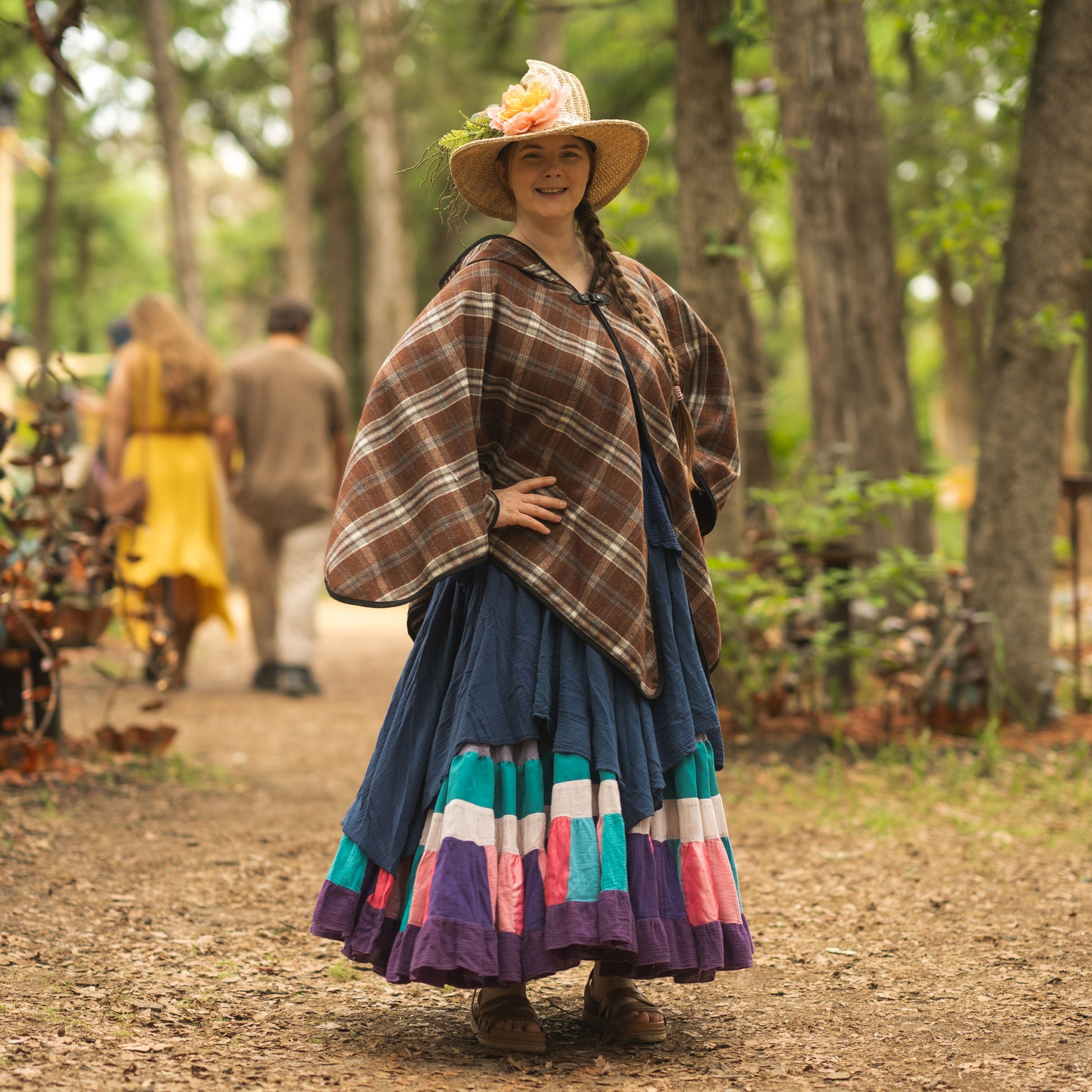 A simple cloak made from a medium weight wool and polyester blend Melton fabric. The Apprentice Adventurer cloaks have a deep hood and a pointed hemline, with a leather snap style clasp.