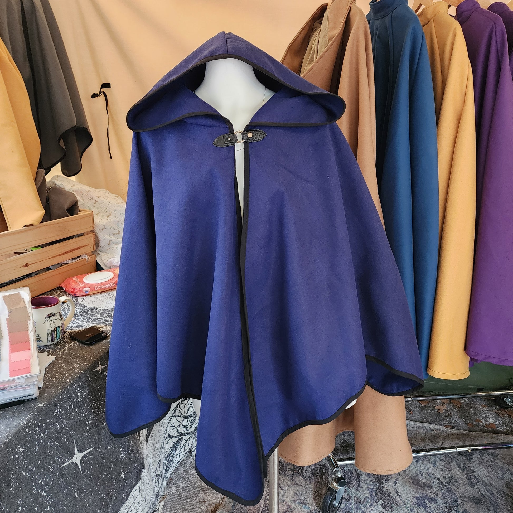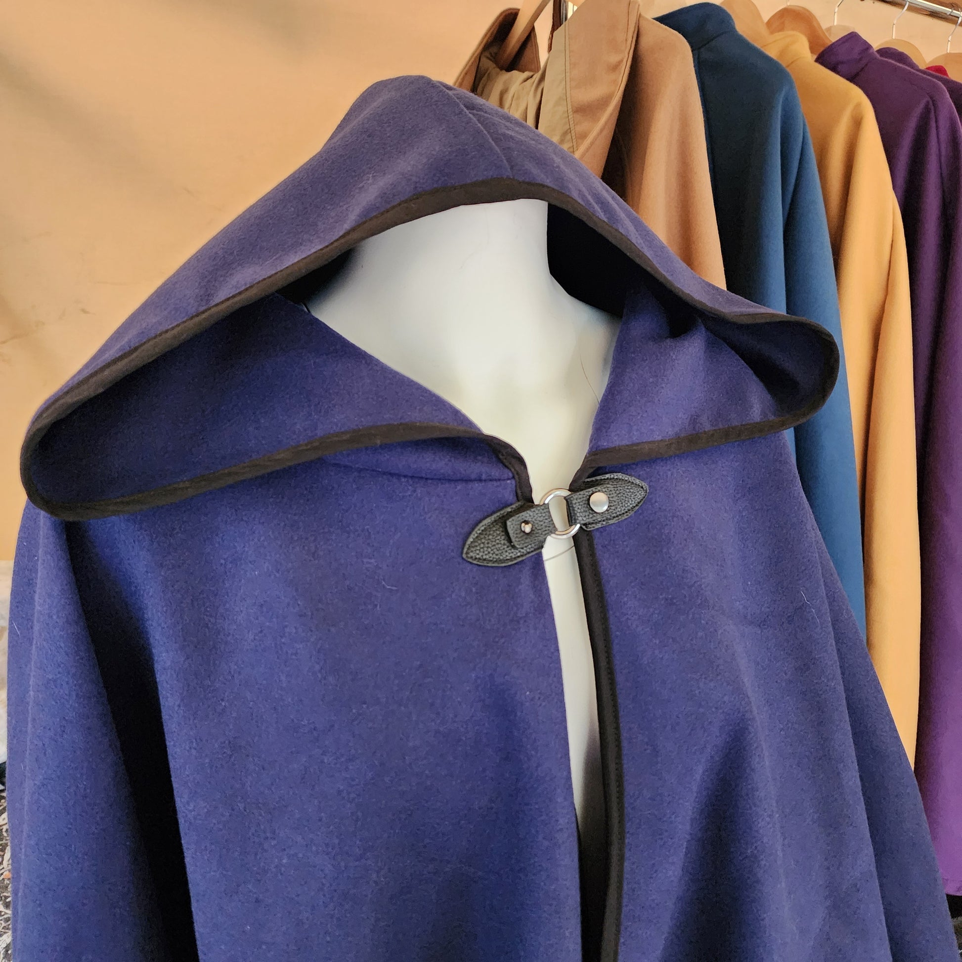 A simple cloak made from a medium weight rayon and polyester blend Melton fabric. The Apprentice Adventurer cloaks have a deep hood and a pointed hemline, with a leather snap style clasp.