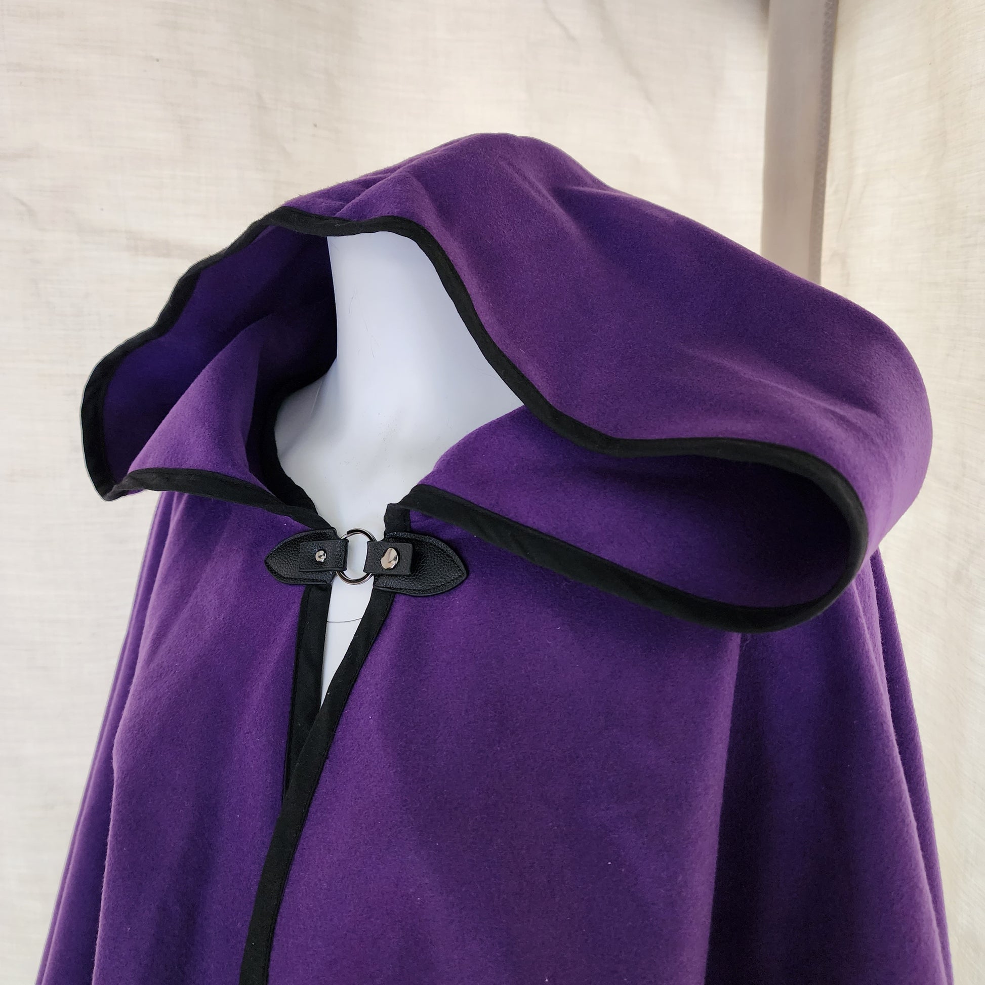 A simple cloak made from a medium weight rayon and polyester blend Melton fabric. The Apprentice Adventurer cloaks have a deep hood and a pointed hemline, with a leather snap style clasp.