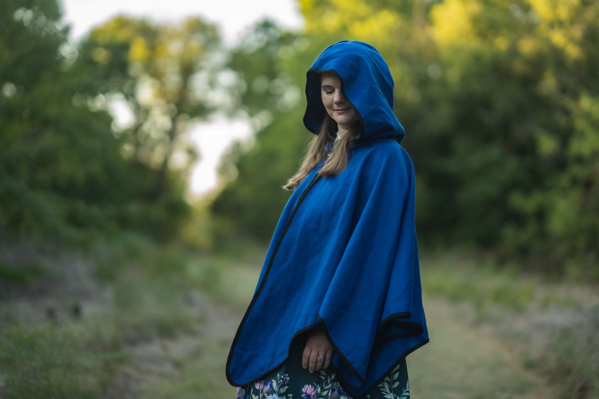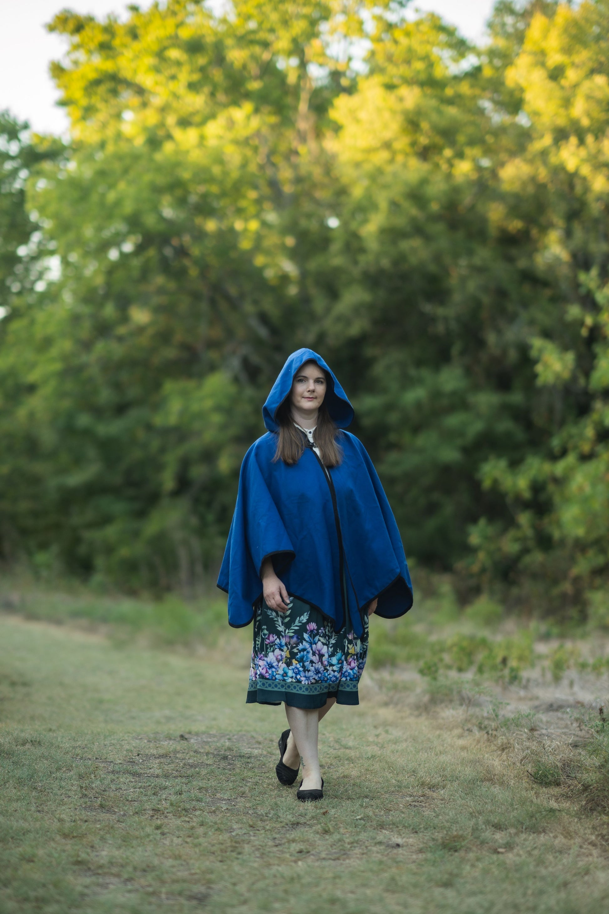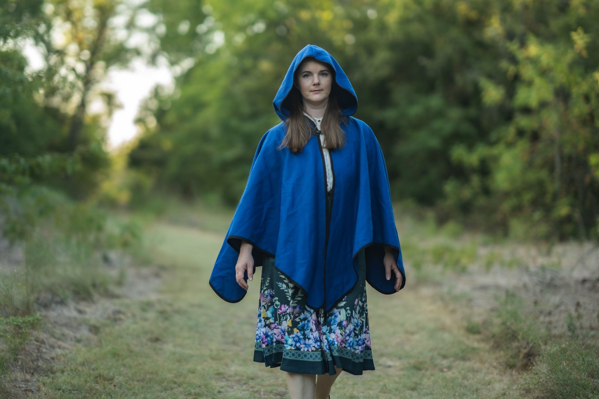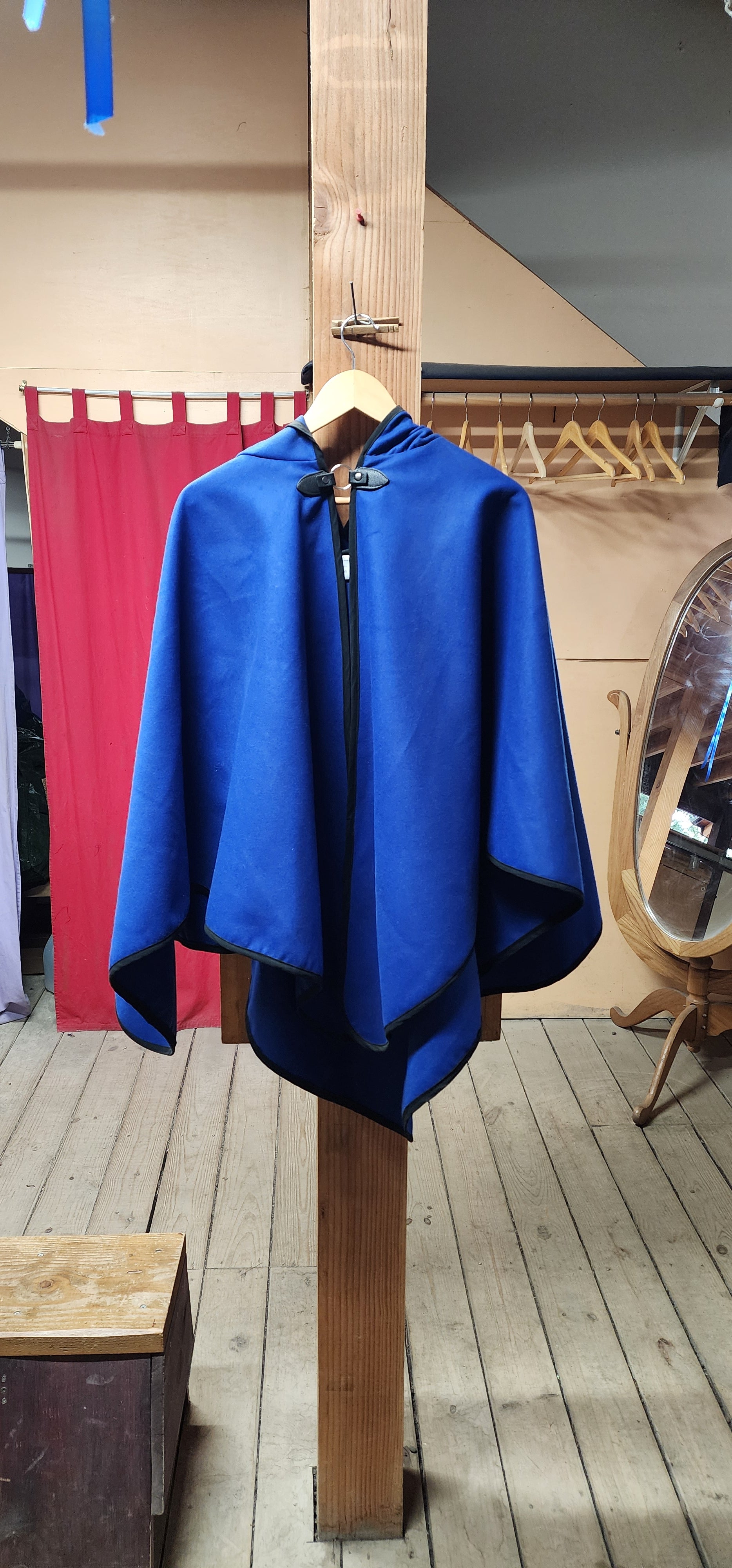 A simple cloak made from a medium weight rayon and polyester blend Melton fabric. The Apprentice Adventurer cloaks have a deep hood and a pointed hemline, with a leather snap style clasp.