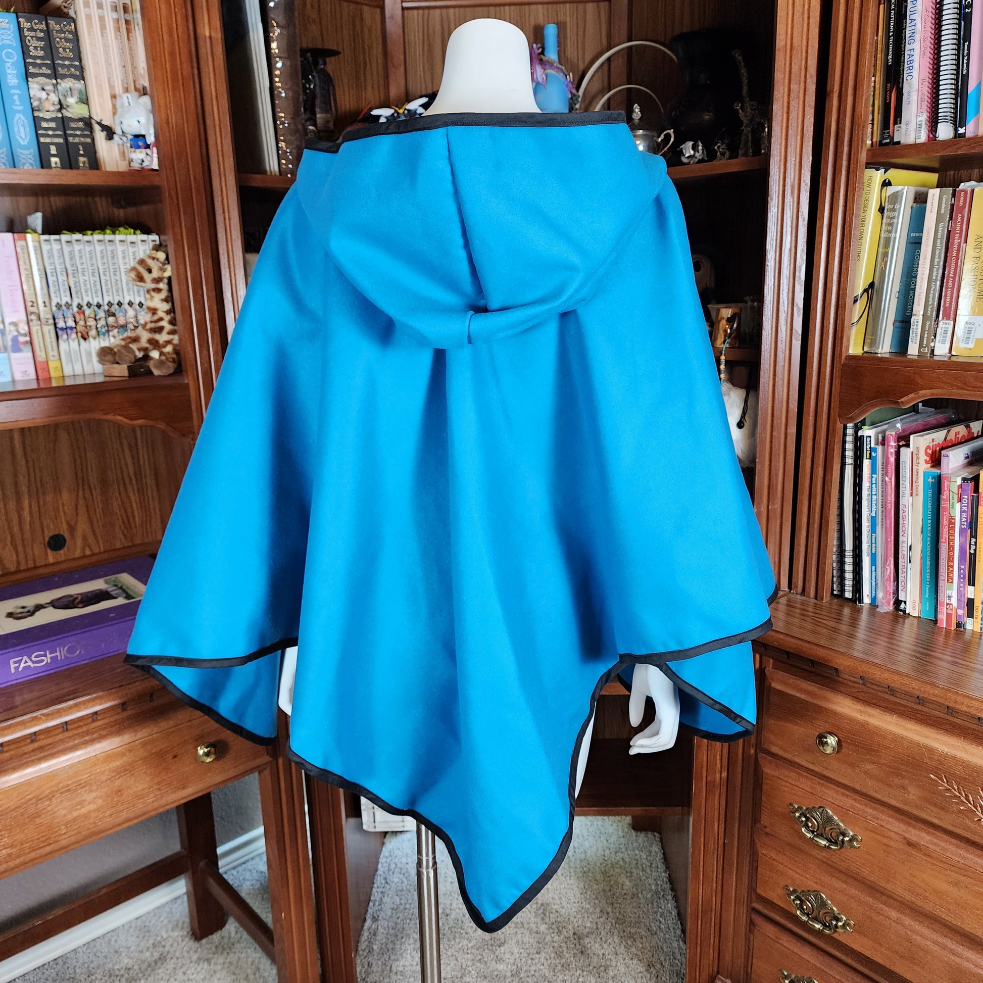 A simple cloak made from a medium weight polyester and rayon blend Melton fabric. The Apprentice Adventurer cloaks have a deep hood and a pointed hemline, with a leather snap style clasp.