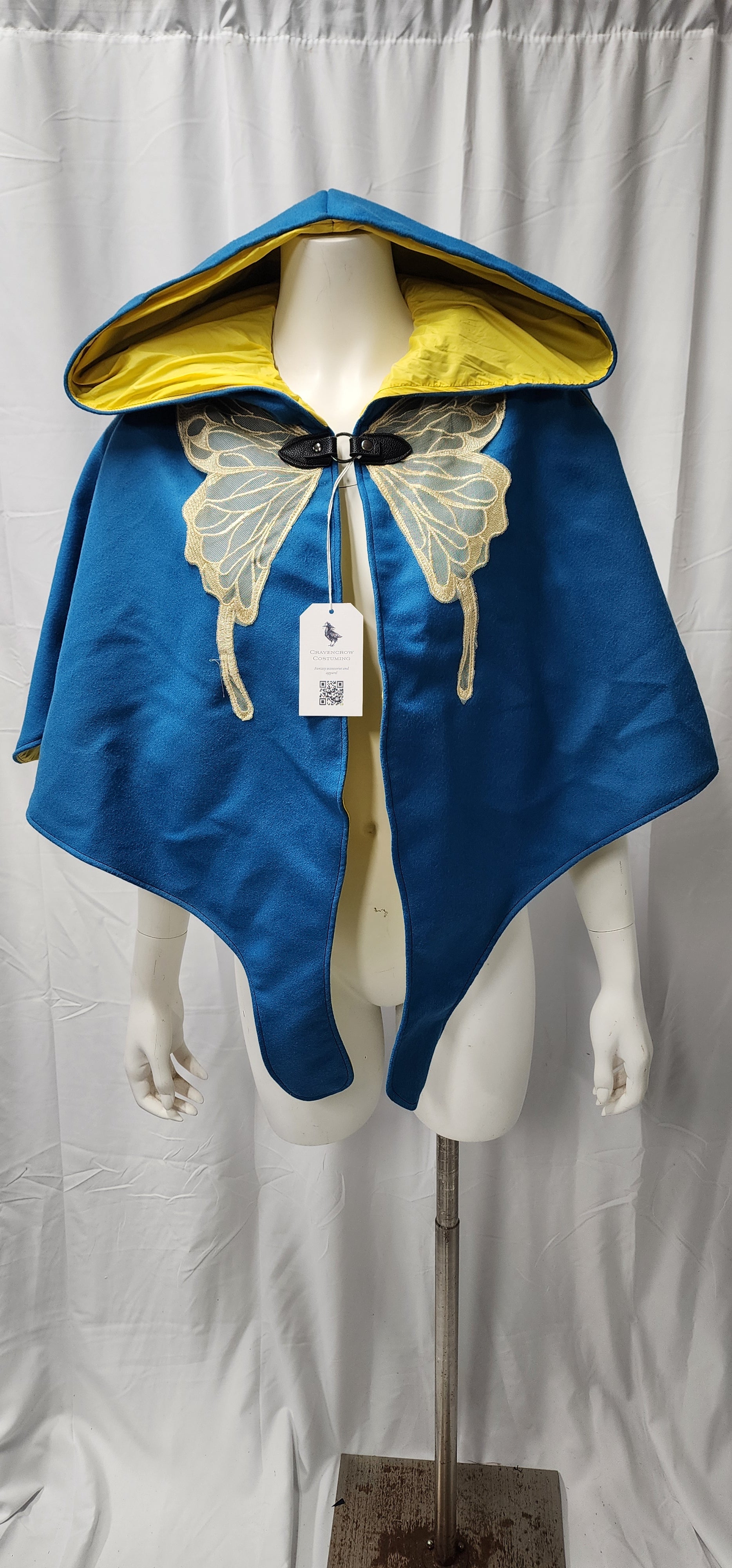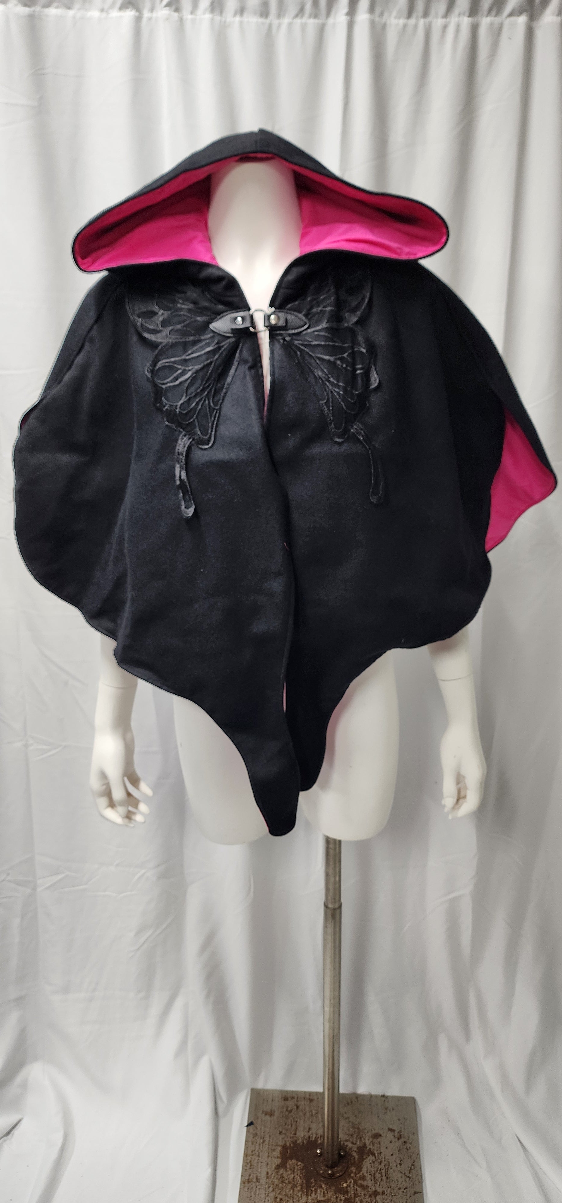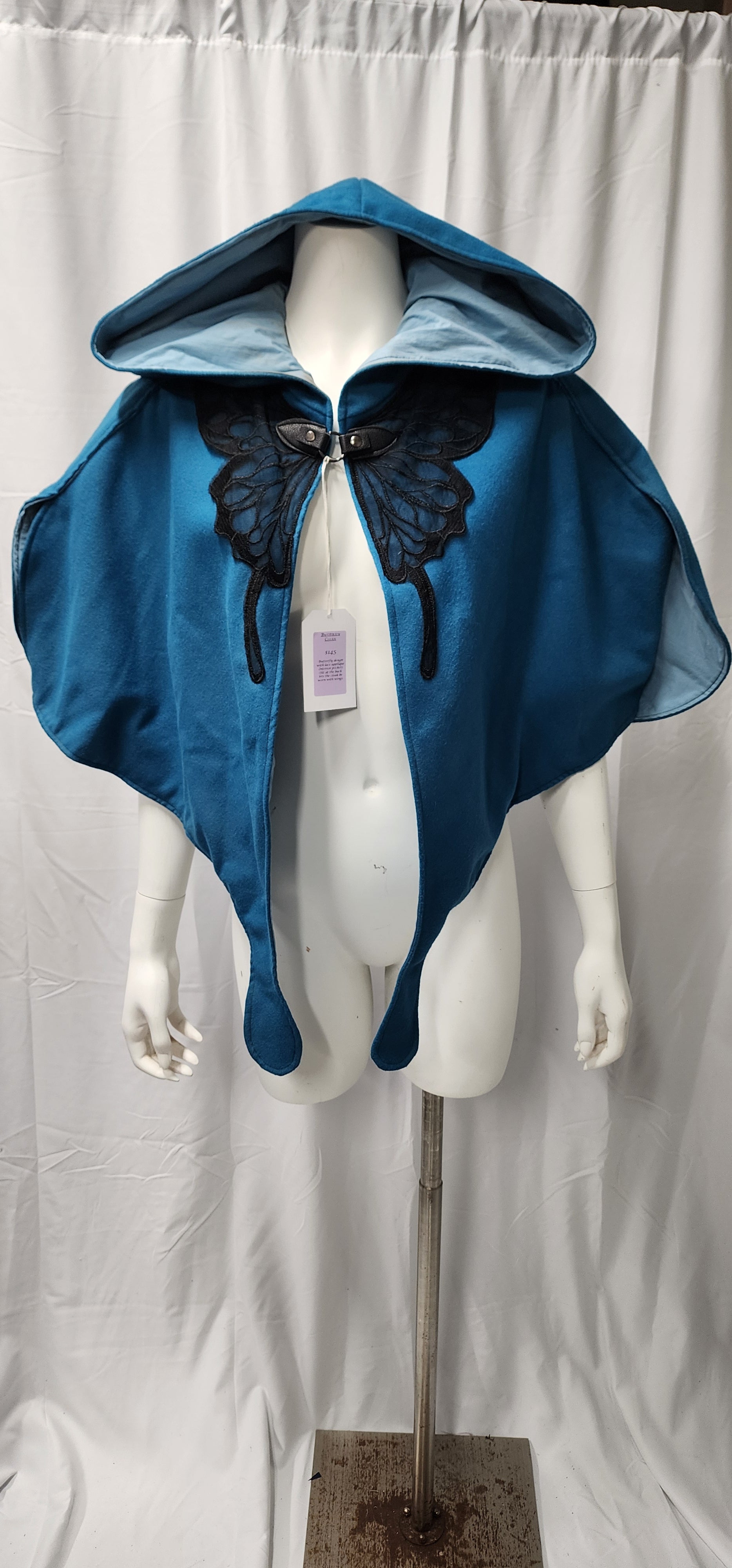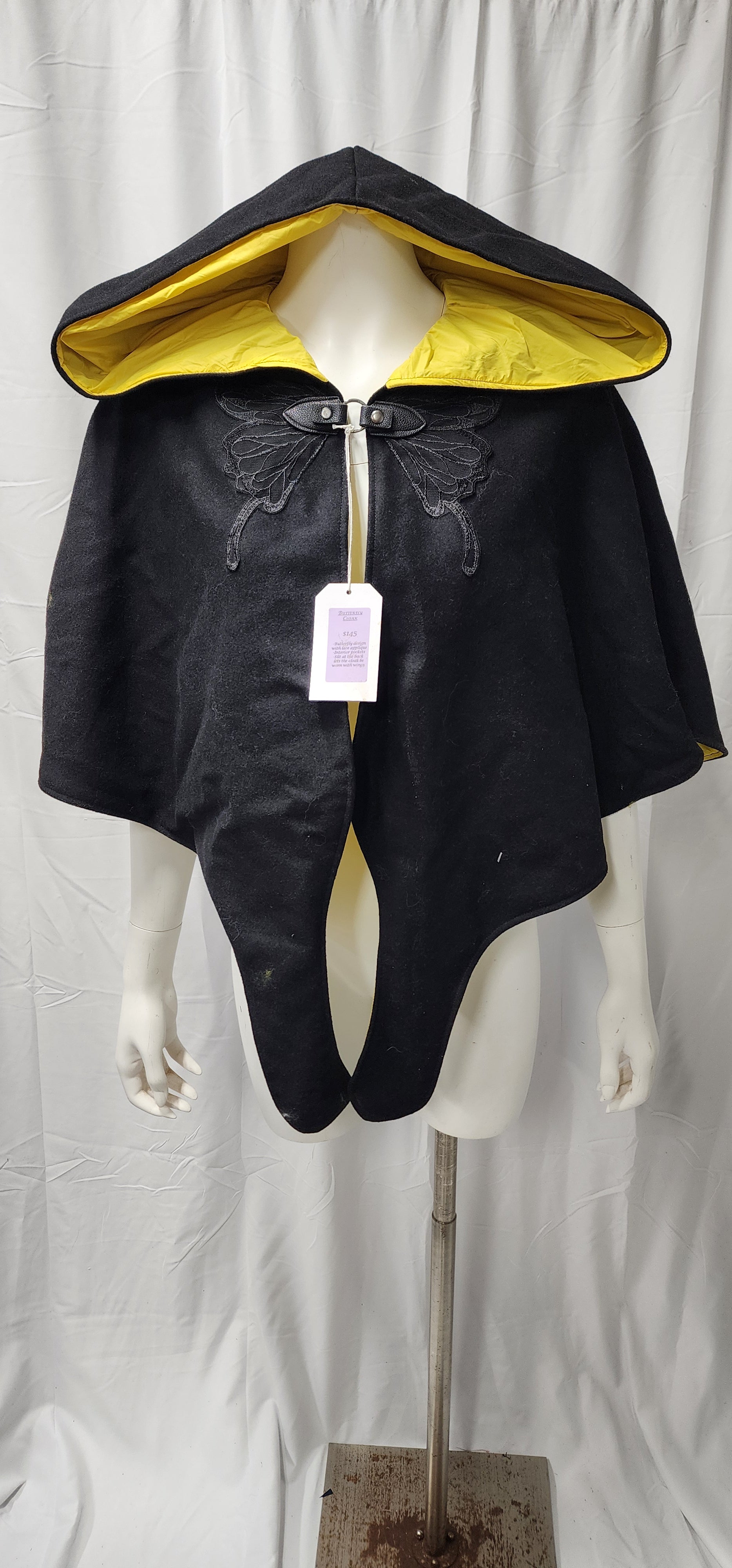 A cute and whimsical cloak shapped like wings with a butterfly applique. And they have pockets!