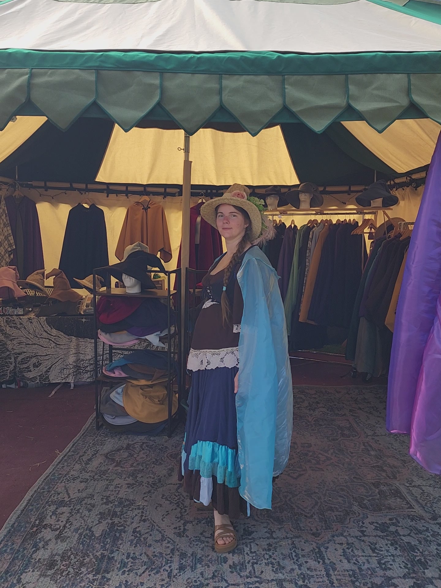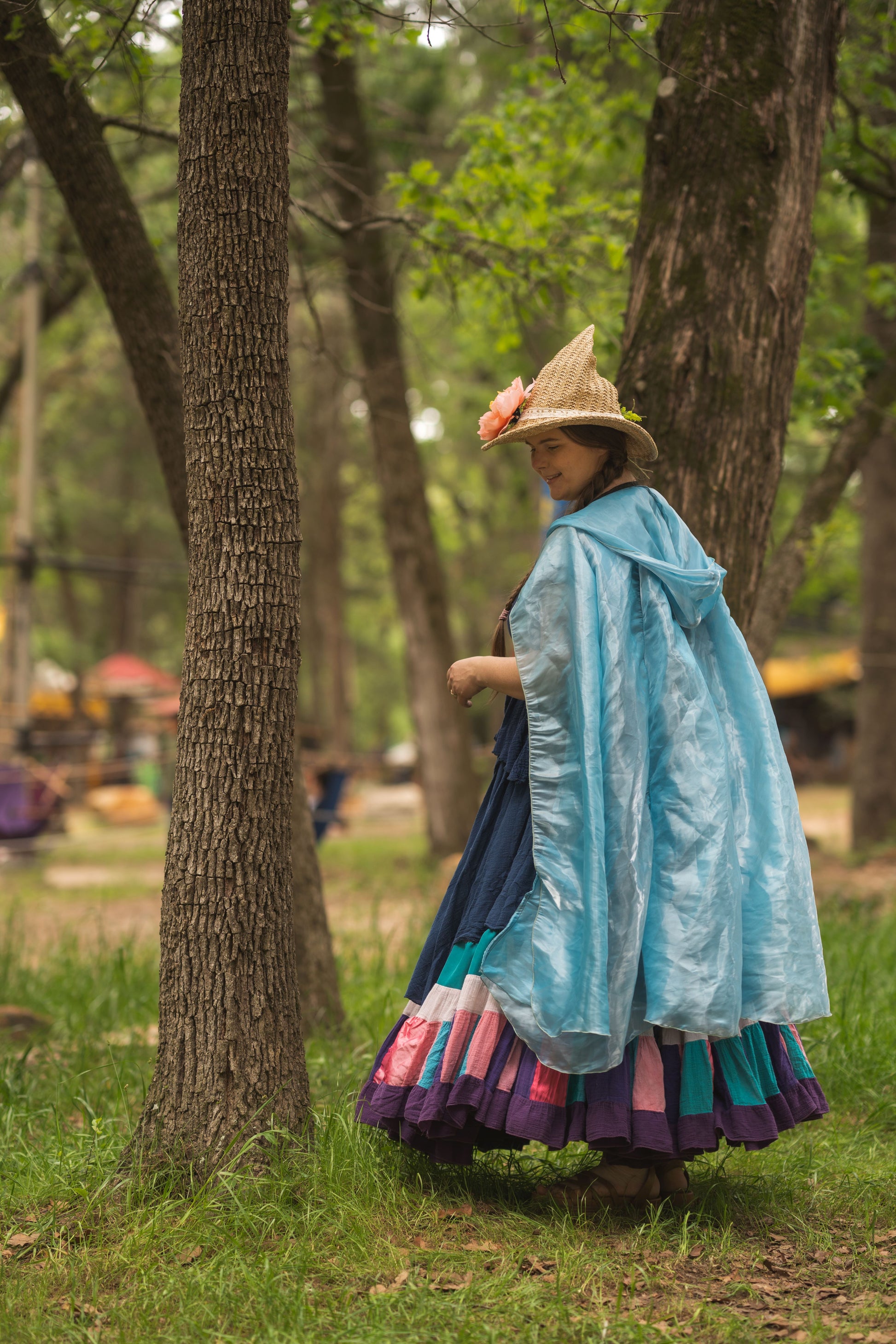 This Fae Shimmer Cloak is made of a semi-transparent iridescent metallic organza that is just absolutely magical when the sun shines on it. It is beautifully lightweight and the fabric seems to just float around the wearer. It's hem is bound in narrow bias tape and the cloak ties at the neckline.