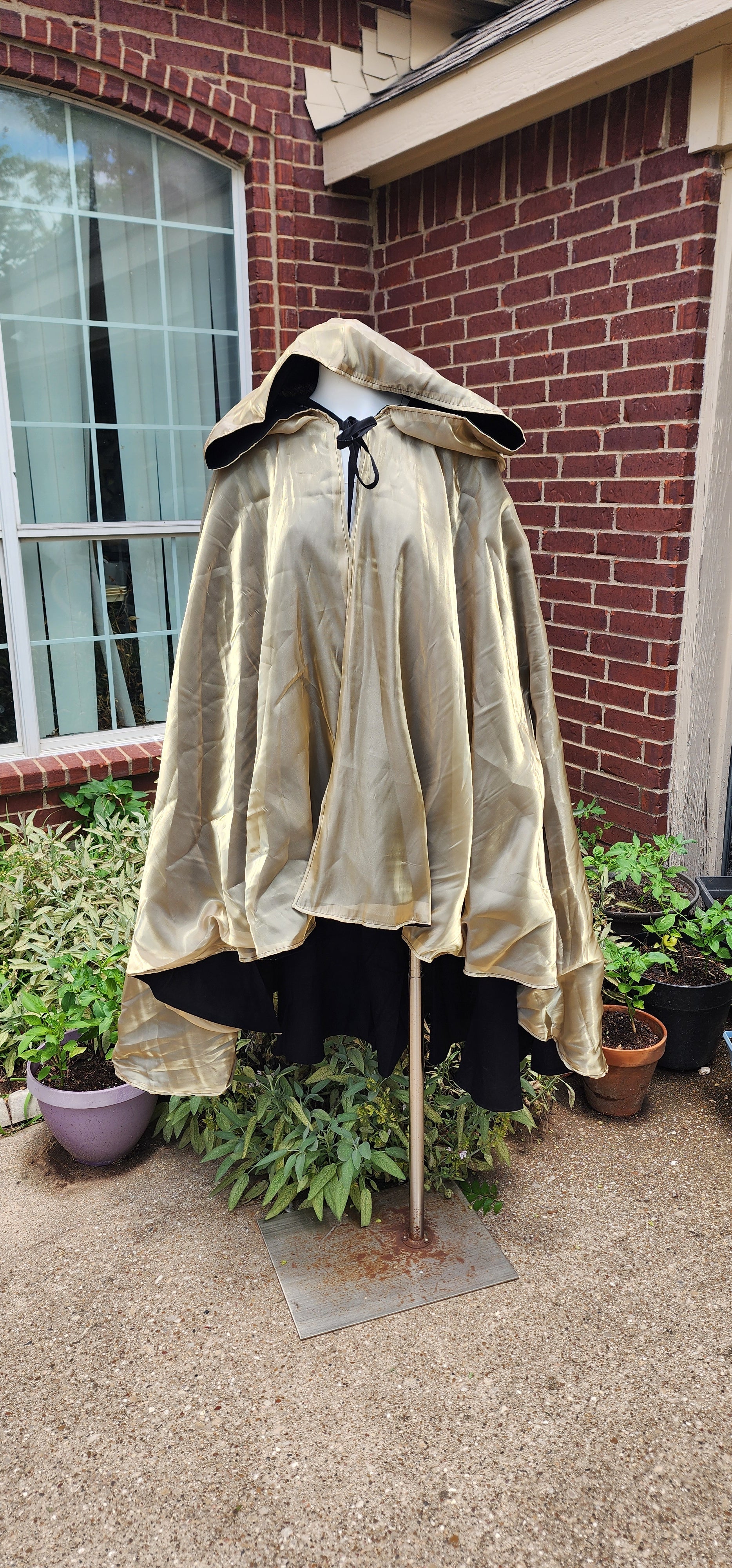 Reversible full circle cloak with high-low hemline and dramatically large hood.