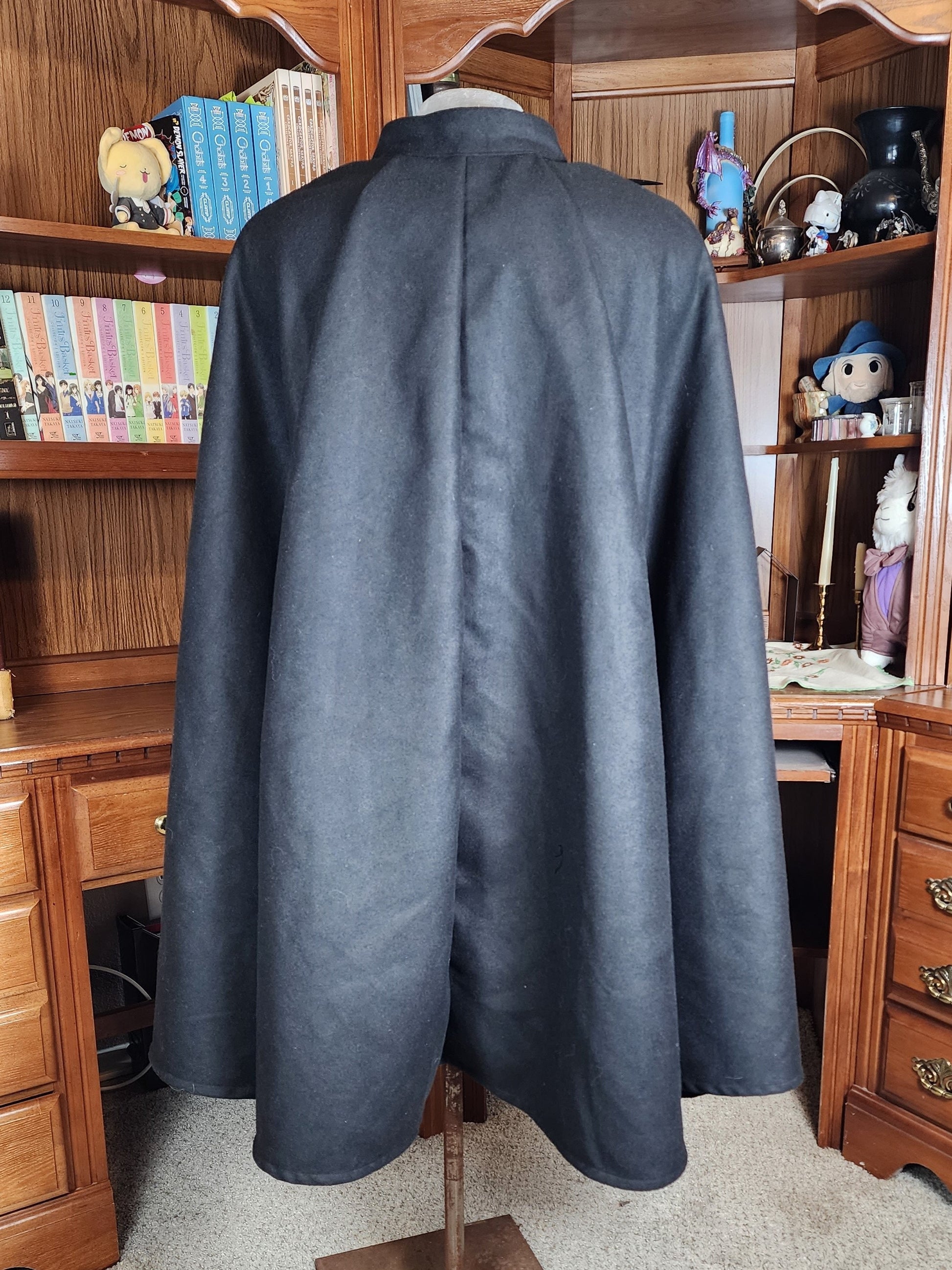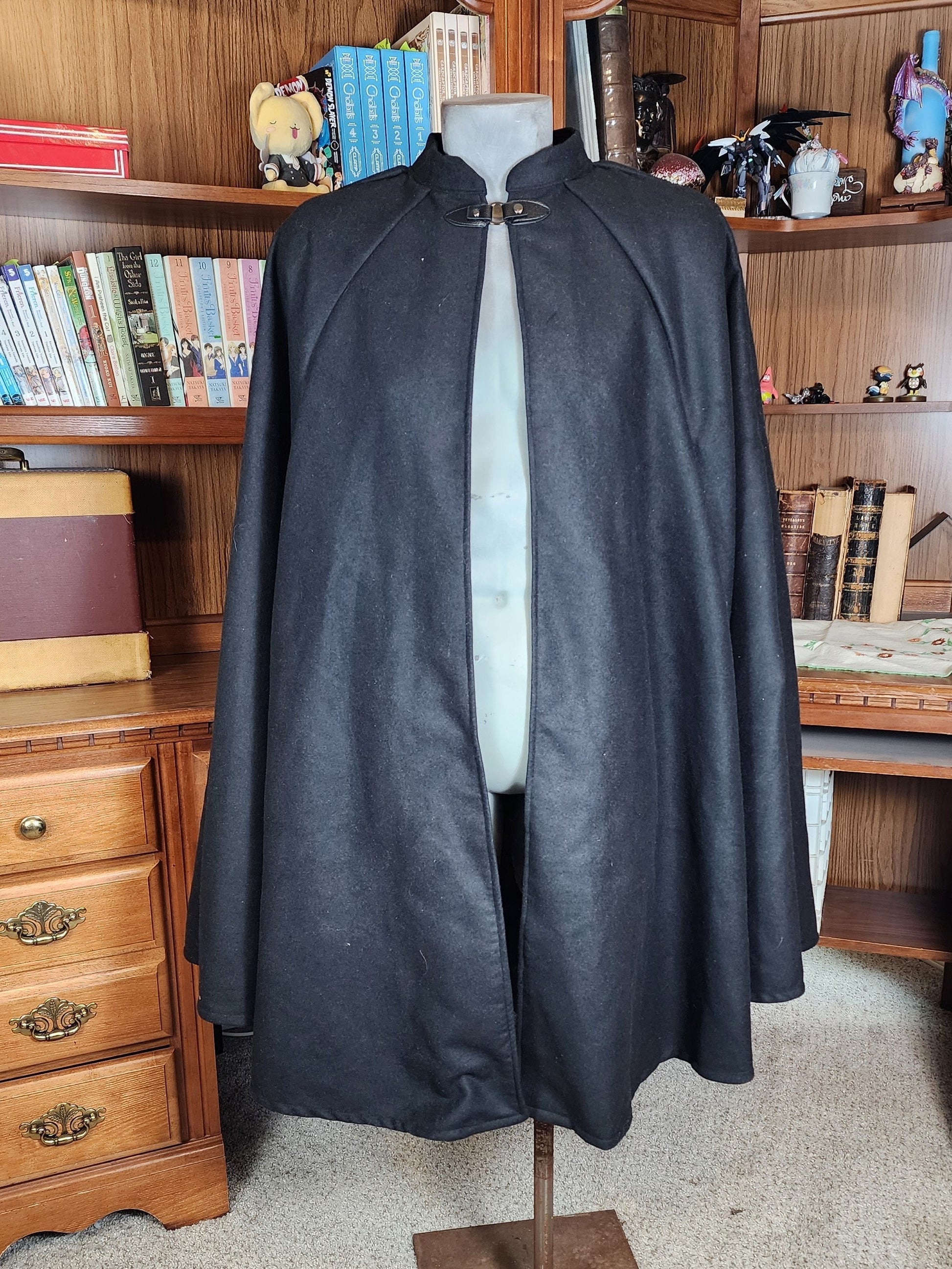 This cloak is made from a Polyester and rayon blend medium weight Melton fabric. The clasp I've chosen for this cloak is a leather snap style.