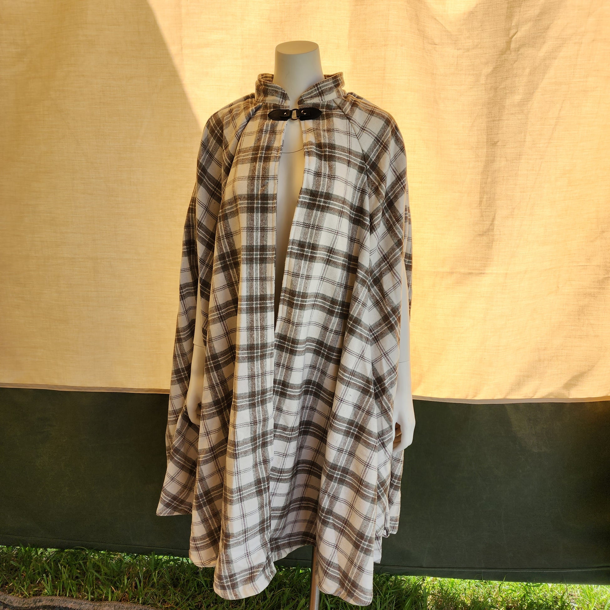 Market Day Cape- Cream Plaid Wool Blend Mid-Length Cape with Collar and Arm Slits