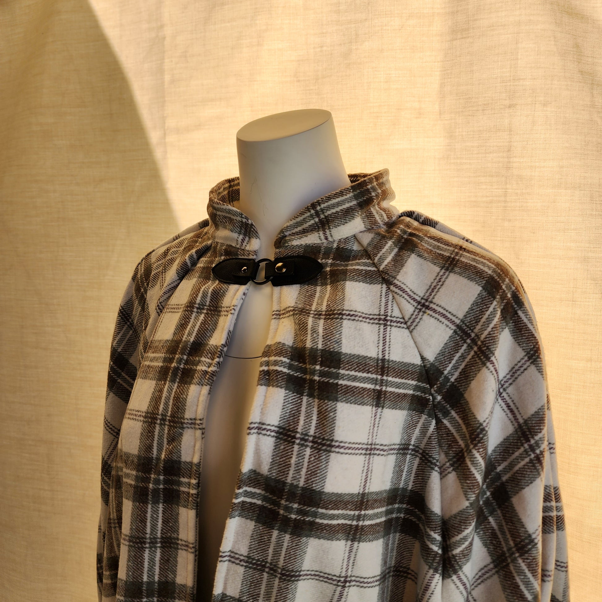 This cloak is made from a wool and polyester blend medium weight Melton fabric. The clasp I've chosen for this cloak is a leather snap style.