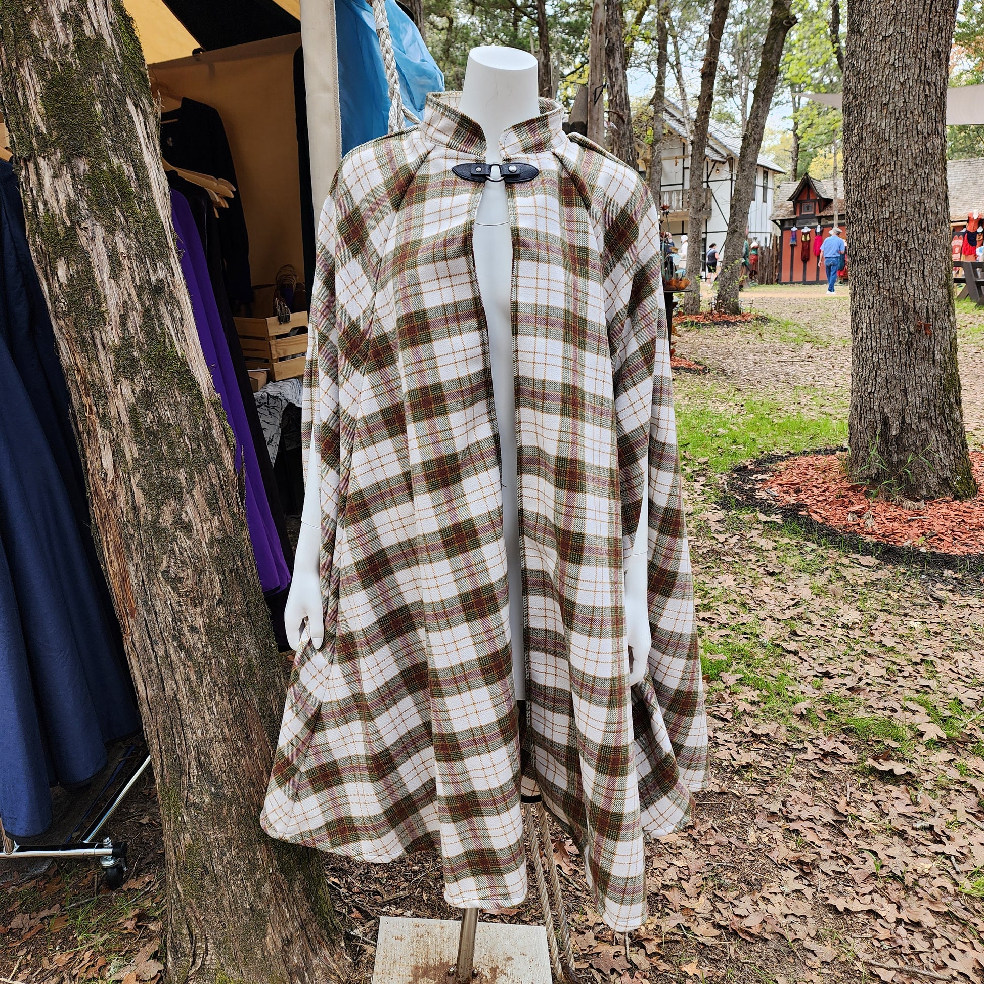 Market Day Cape- Green and Cream Plaid Wool Blend Mid-Length Cape with Collar and Arm Slits