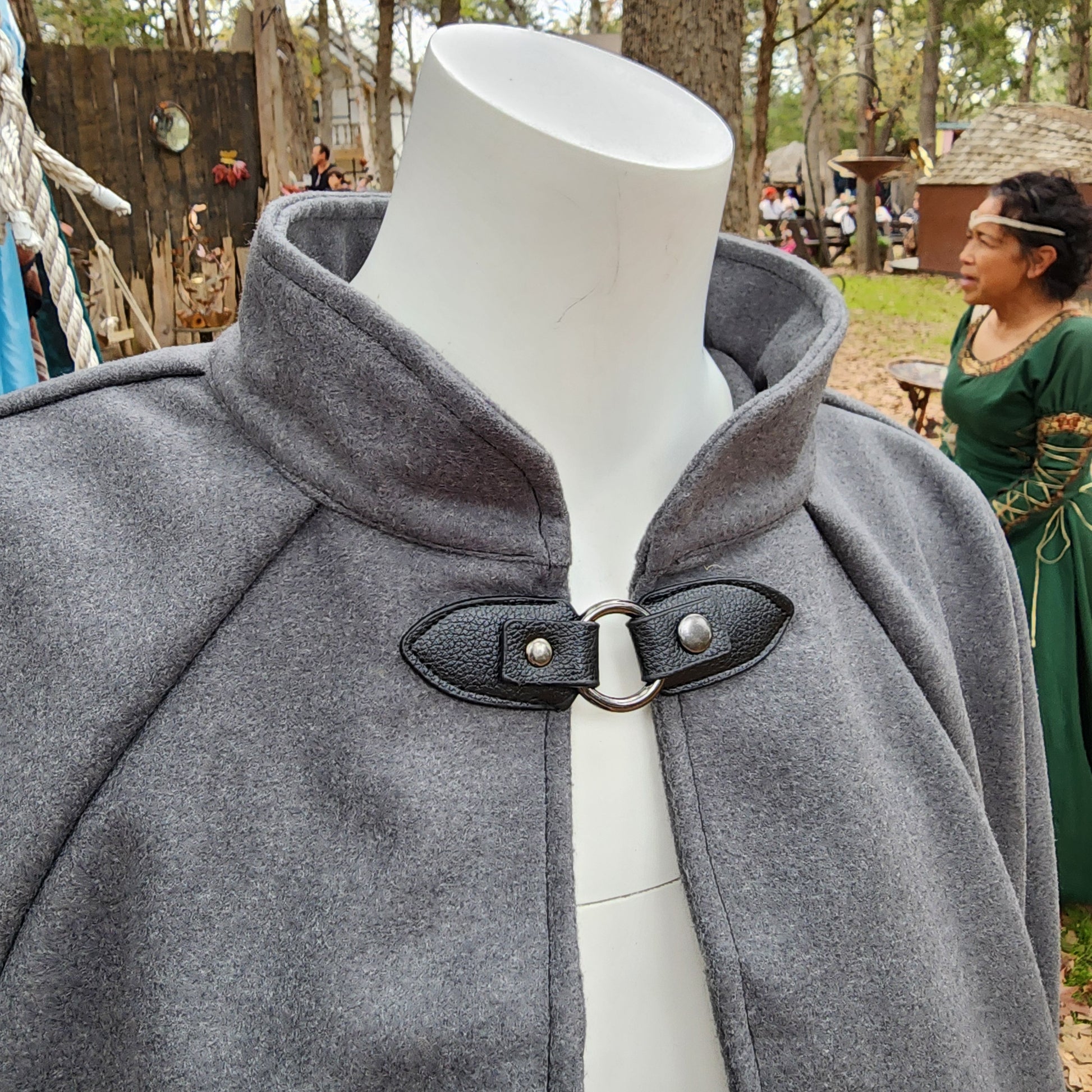 This cloak is made from a polyester and rayon blend medium weight Melton fabric. The clasp I've chosen for this cloak is a leather snap style.