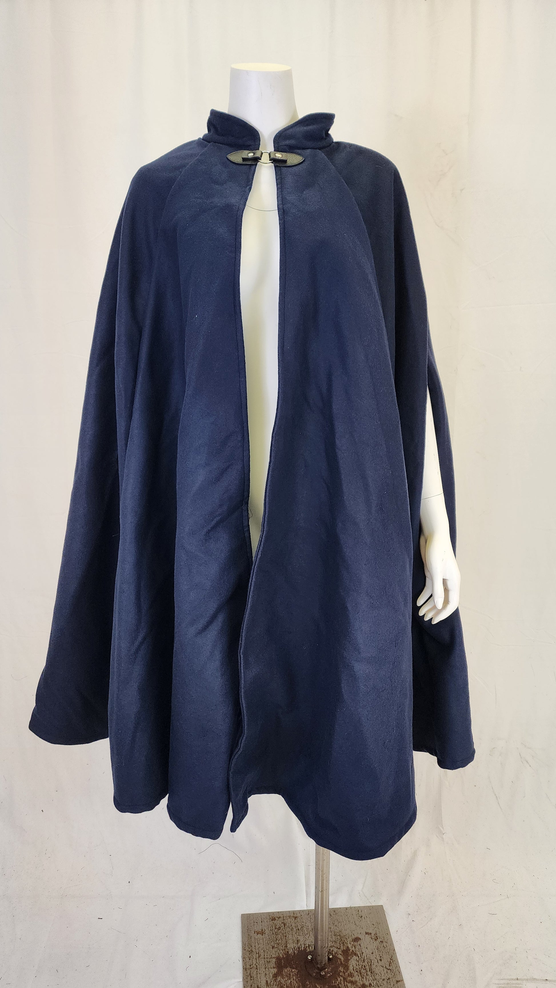 This cloak is made from a Polyester and rayon blend medium weight Melton fabric. The clasp I've chosen for this cloak is a leather snap style.