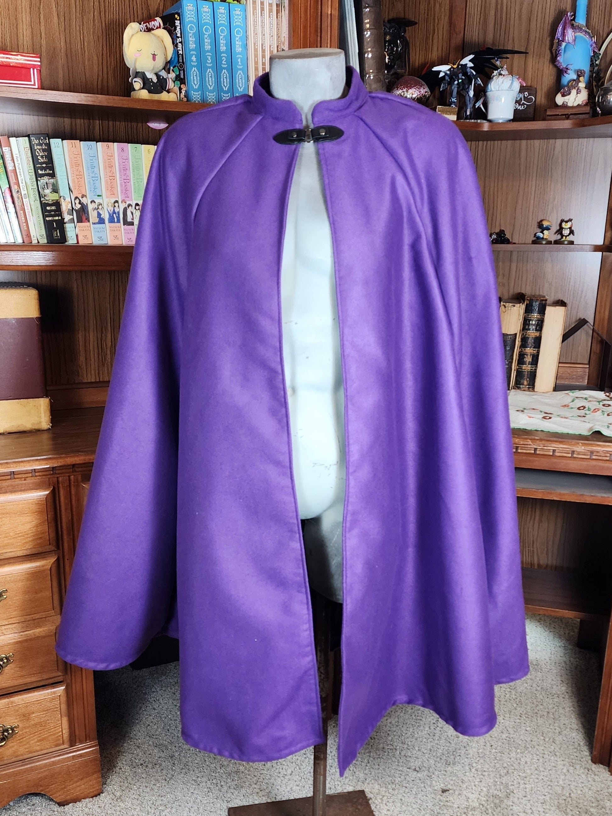 This cloak is made from a Polyester and rayon blend medium weight Melton fabric. The clasp I've chosen for this cloak is a leather snap style.