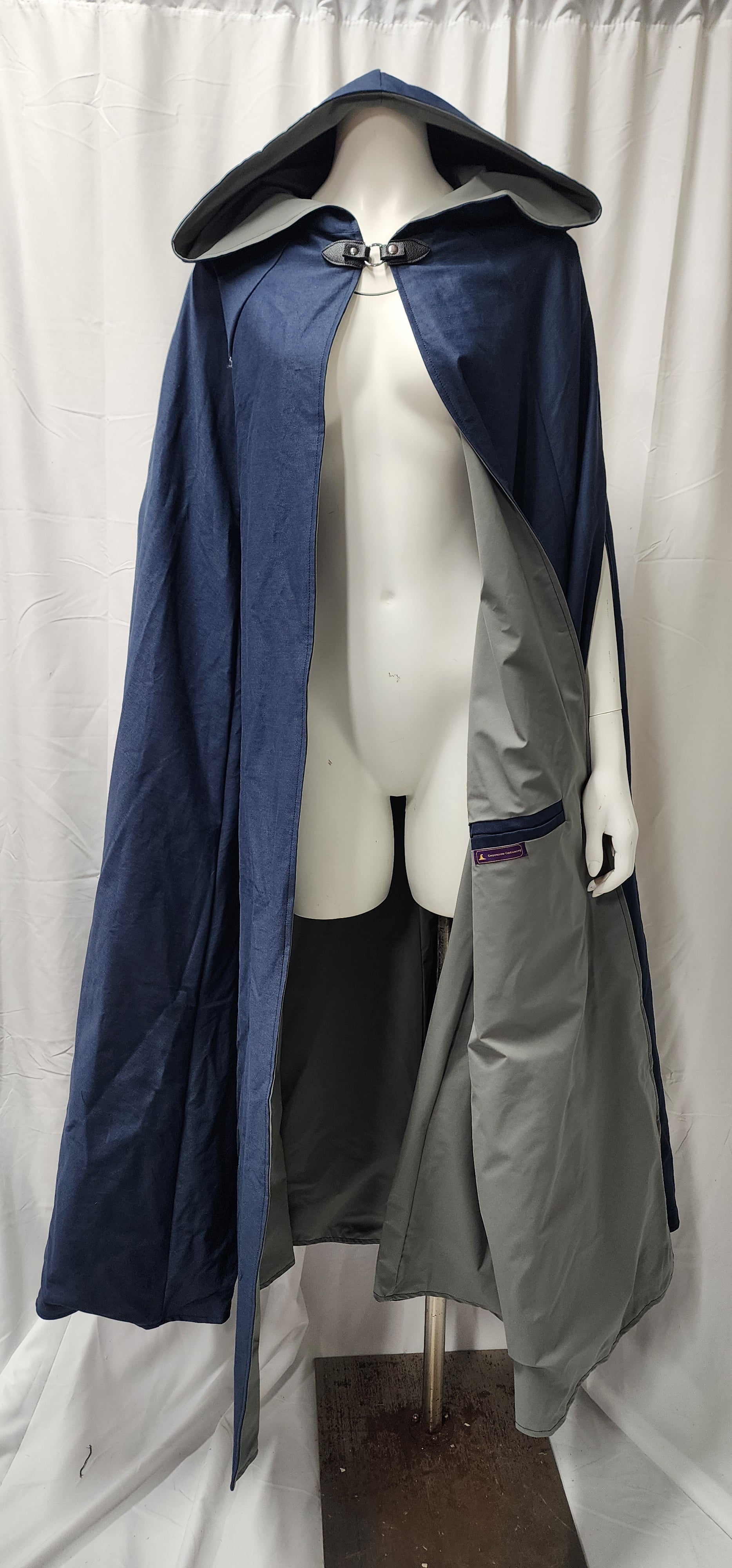 A dramatic cloak perfect for stalking down alleyways or climbing up towers, this Nightblade cloak features a cotton twill outer fabric with a water resistant polyester lining. This cloak has a deep hood, arm-slits, and inseam pockets.