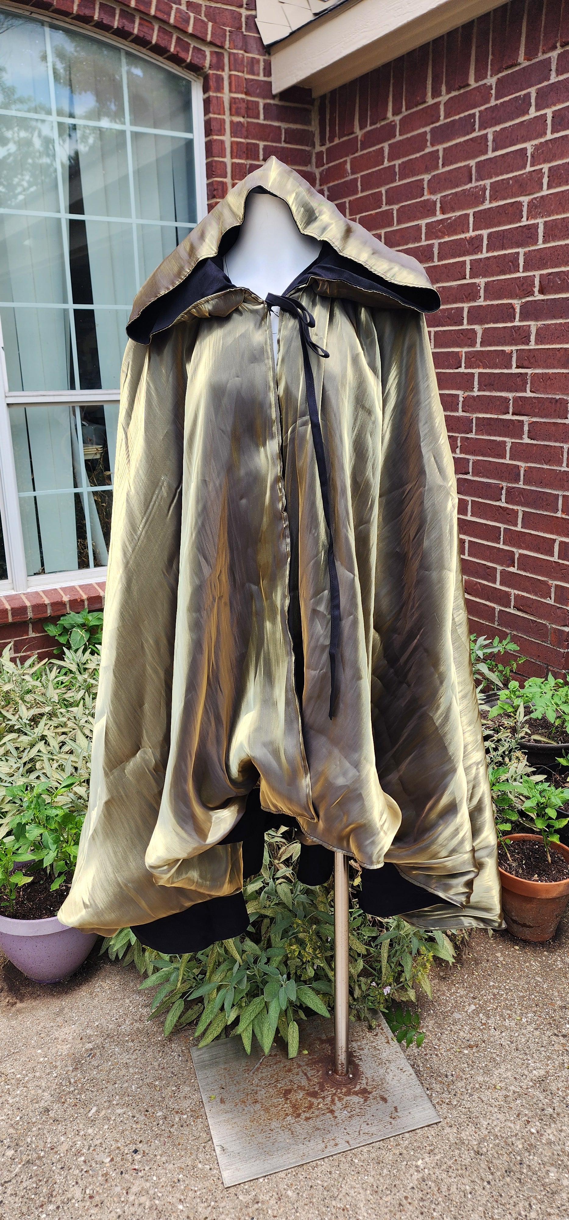 Reversible full circle cloak with high-low hemline and dramatically large hood.