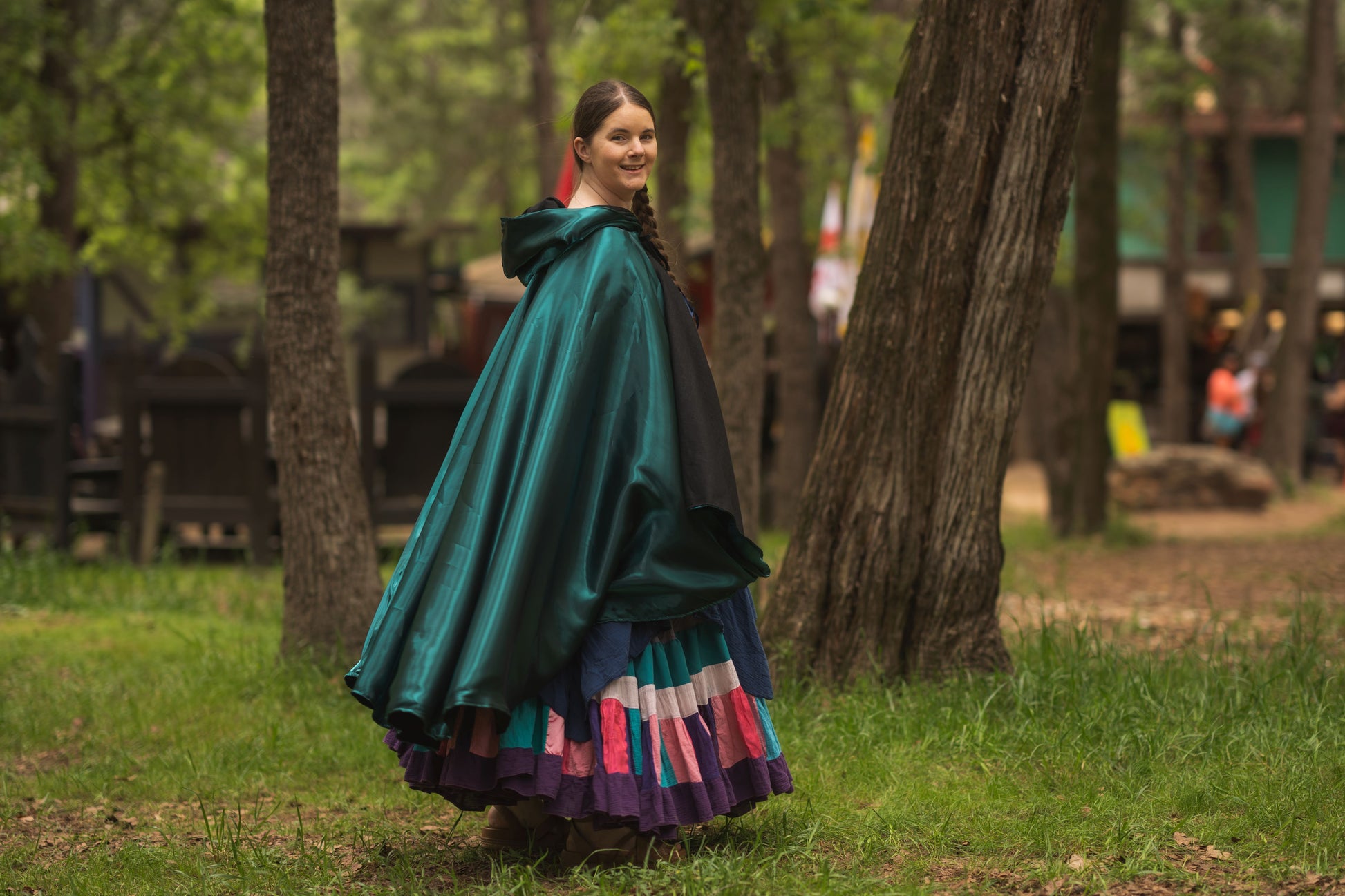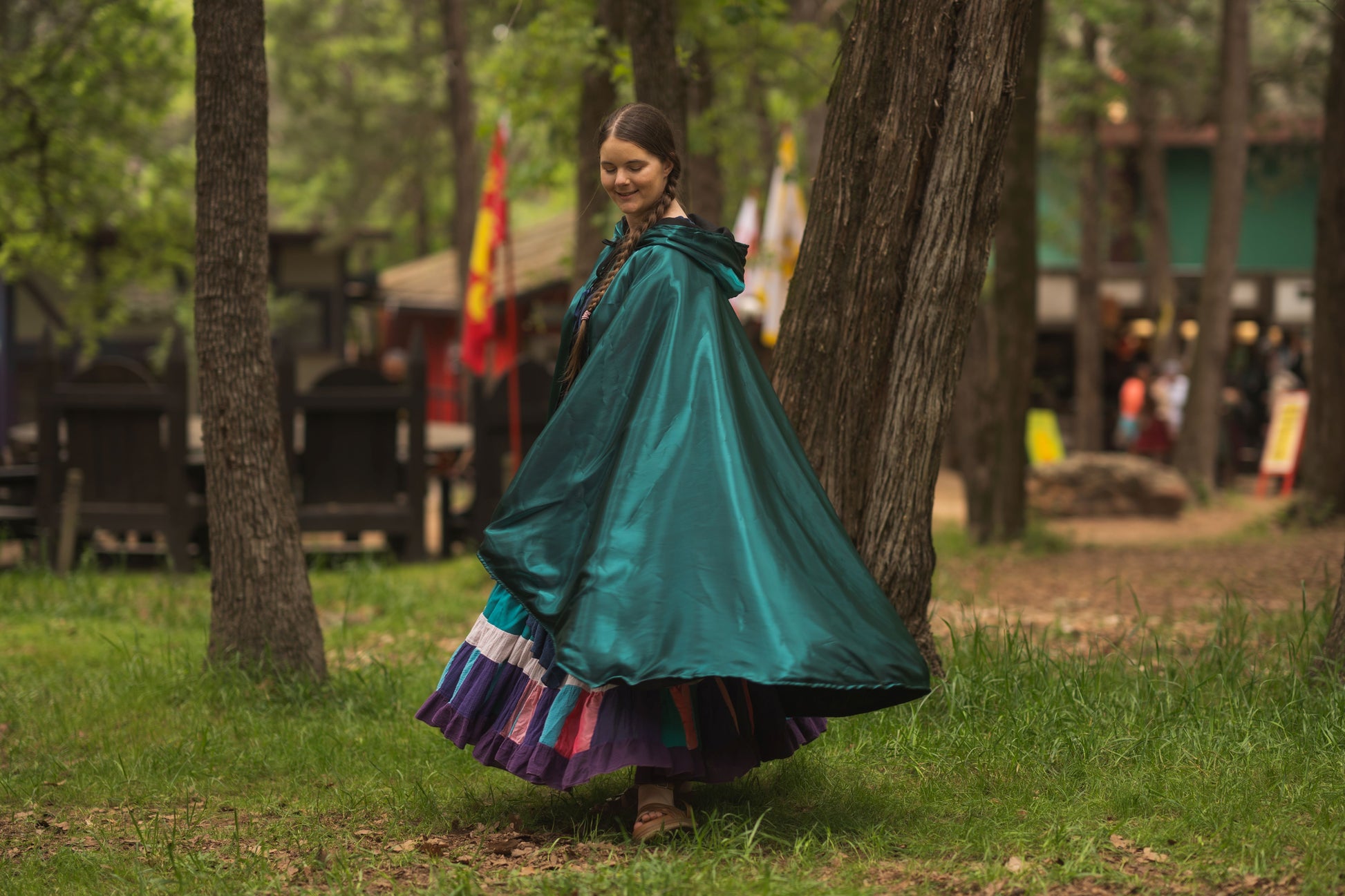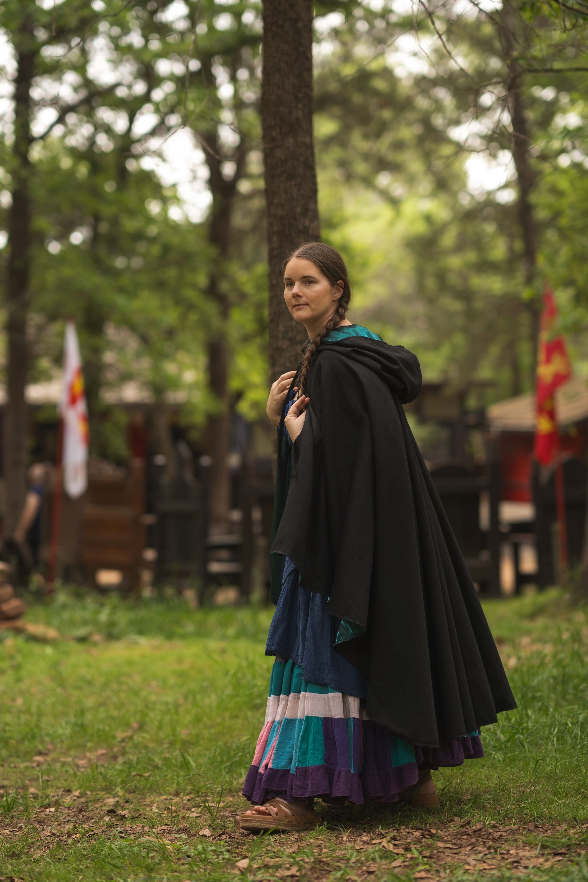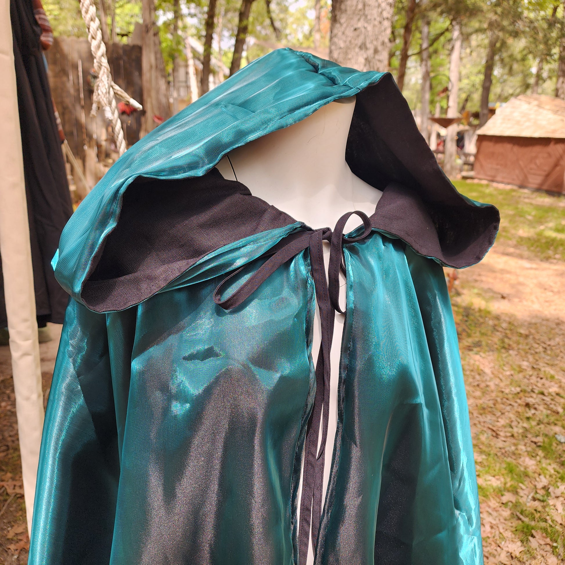 Reversible full circle cloak with high-low hemline and dramatically large hood.