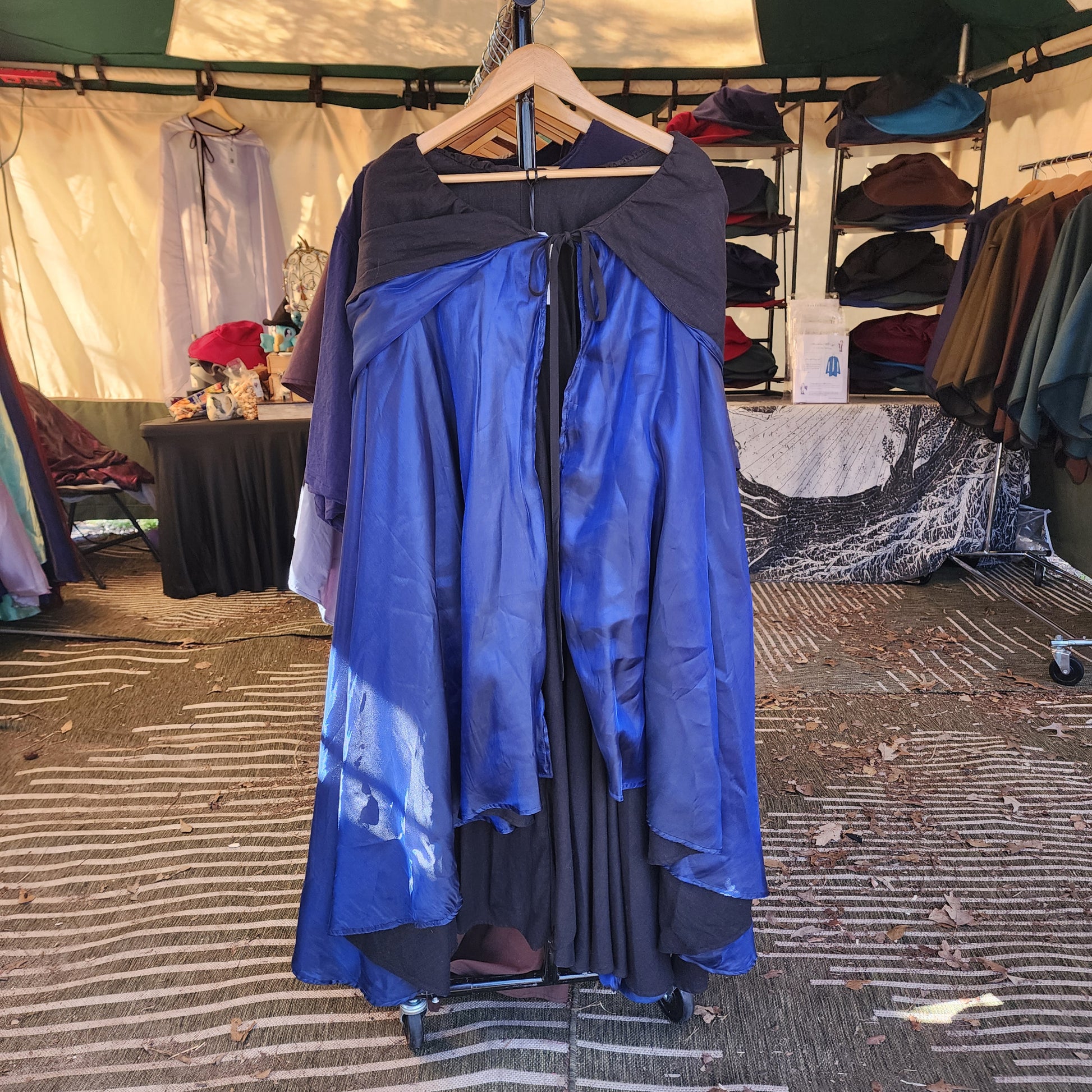 Reversible full circle cloak with high-low hemline and dramatically large hood.