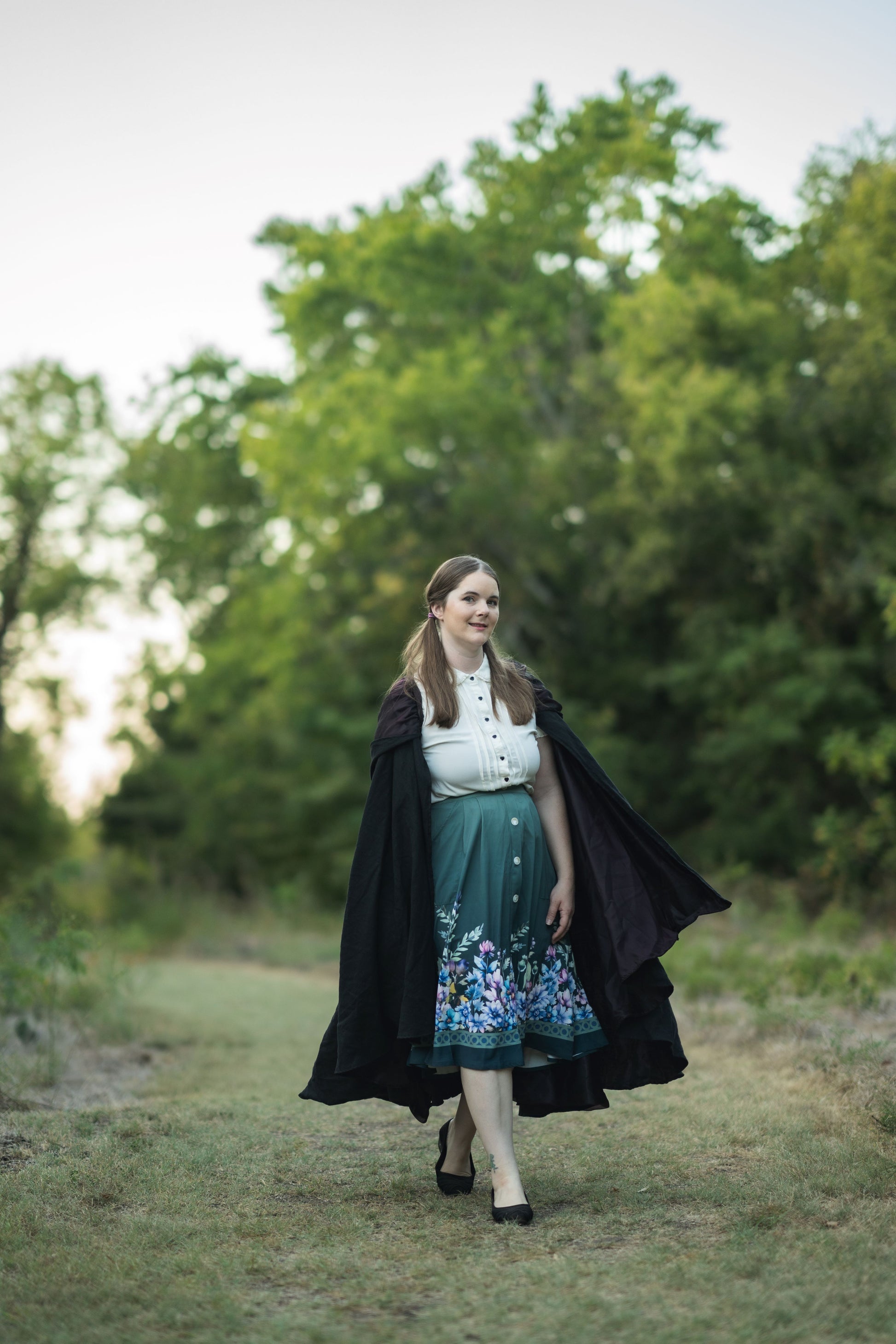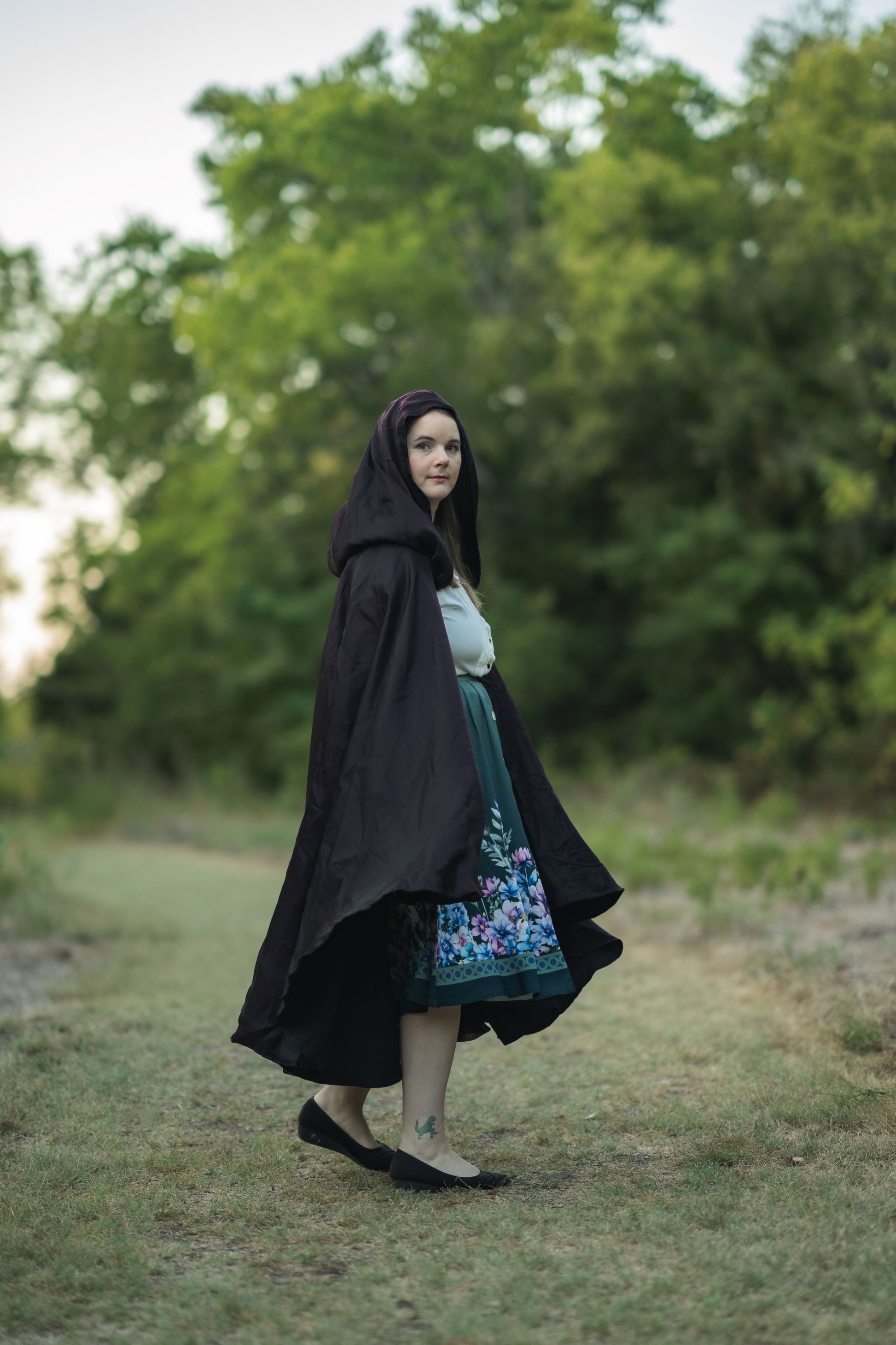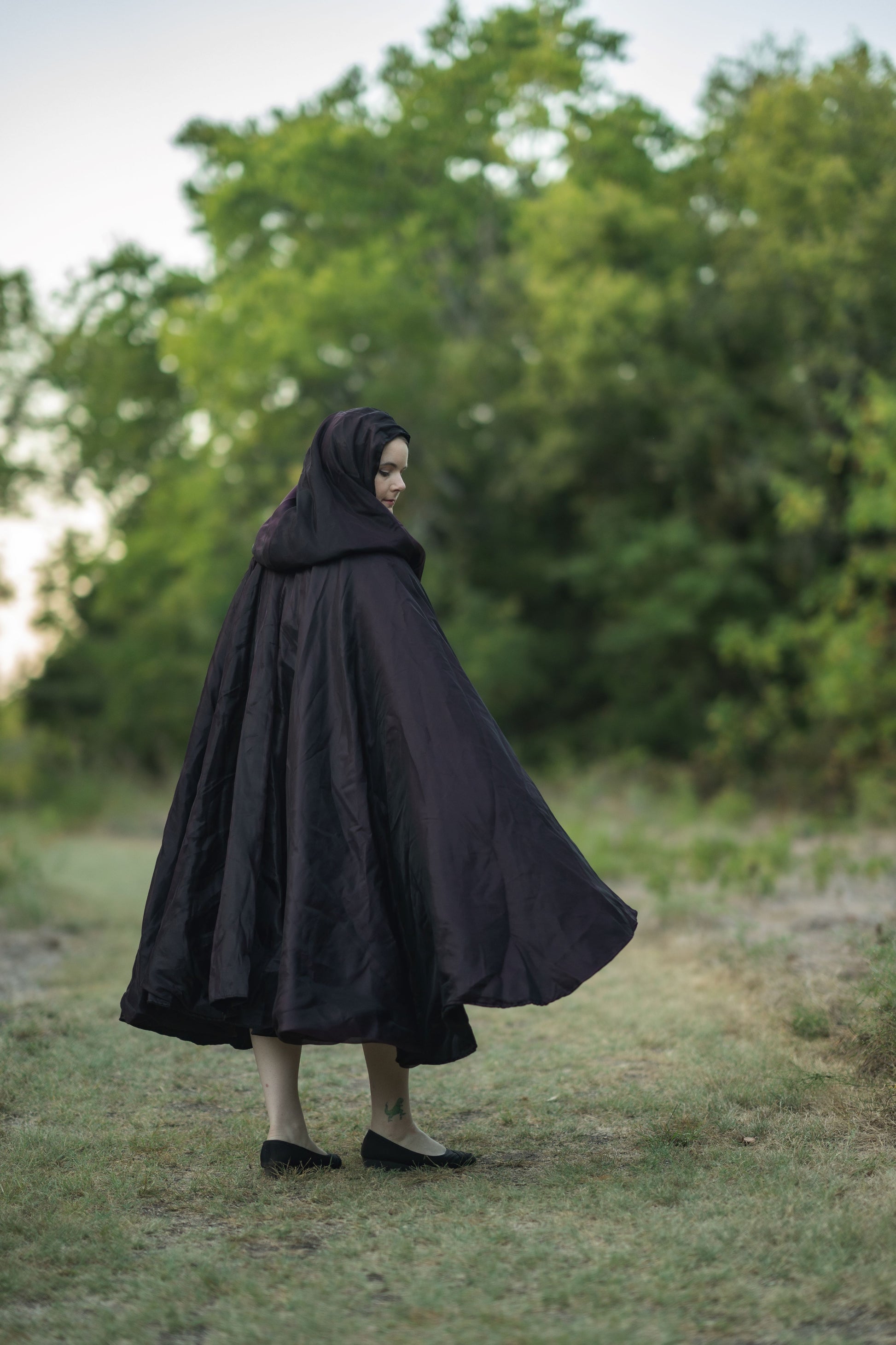 Reversible full circle cloak with high-low hemline and dramatically large hood.