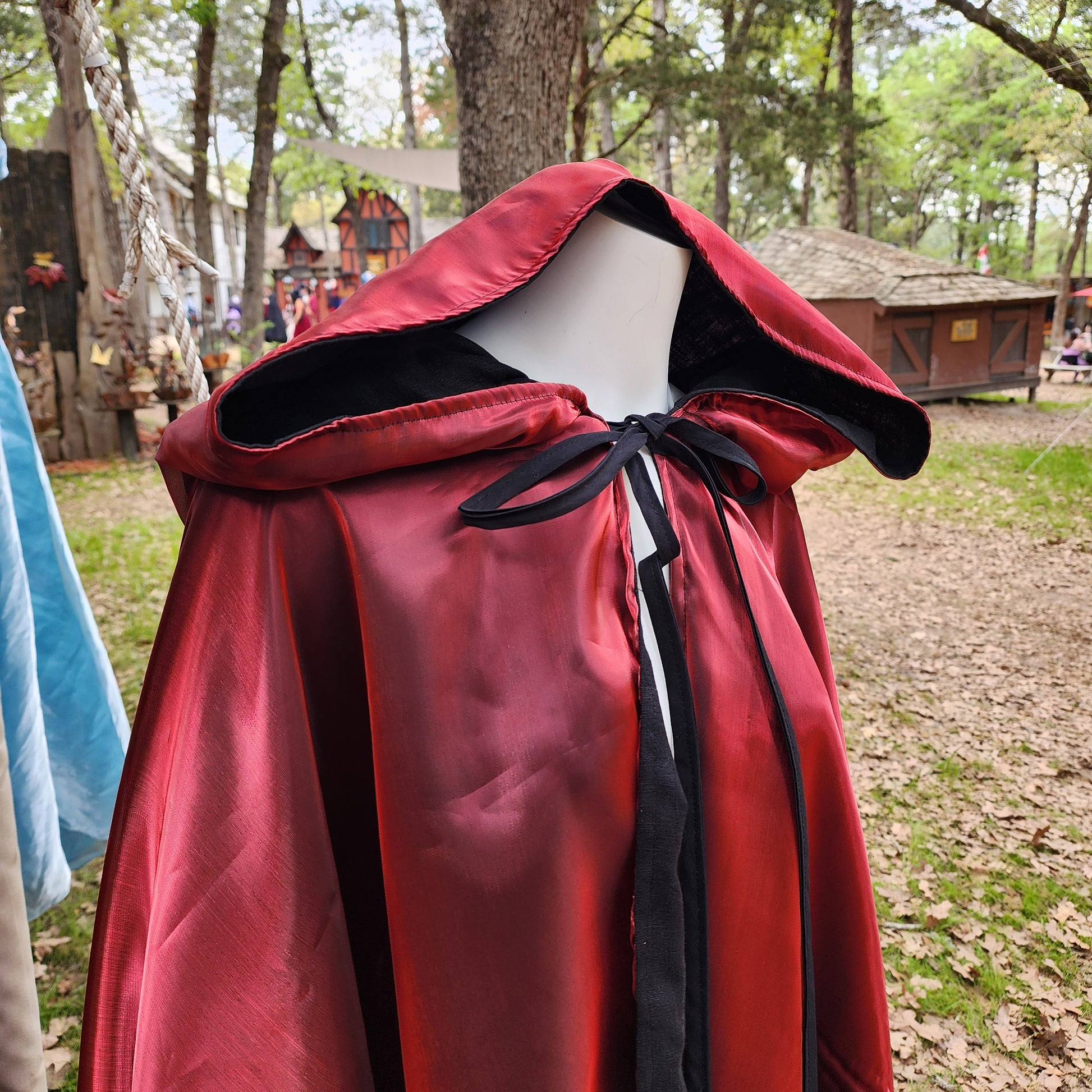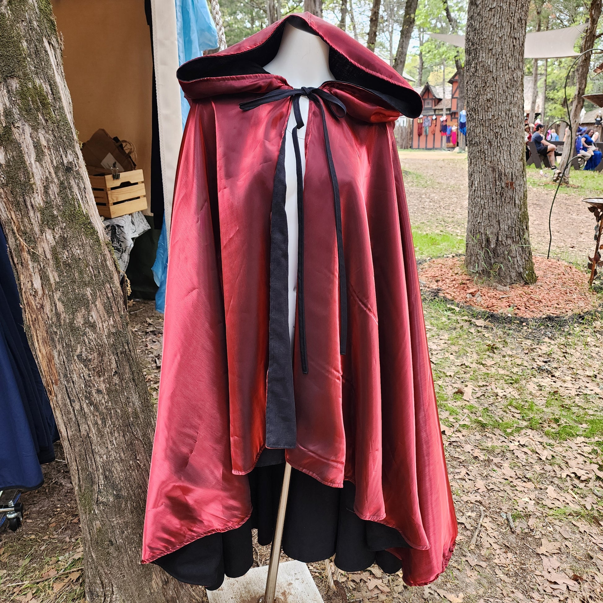 Reversible full circle cloak with high-low hemline and dramatically large hood.