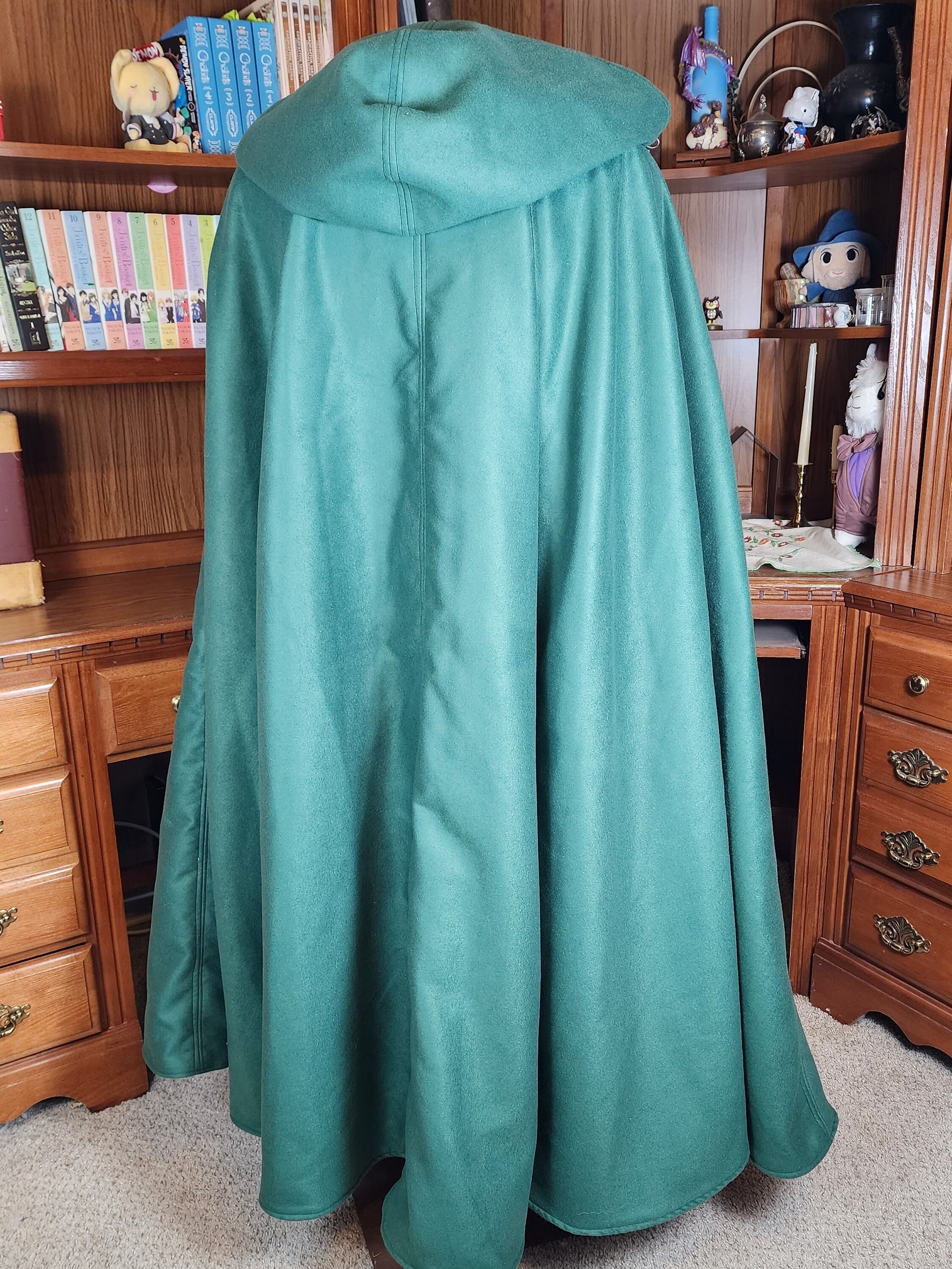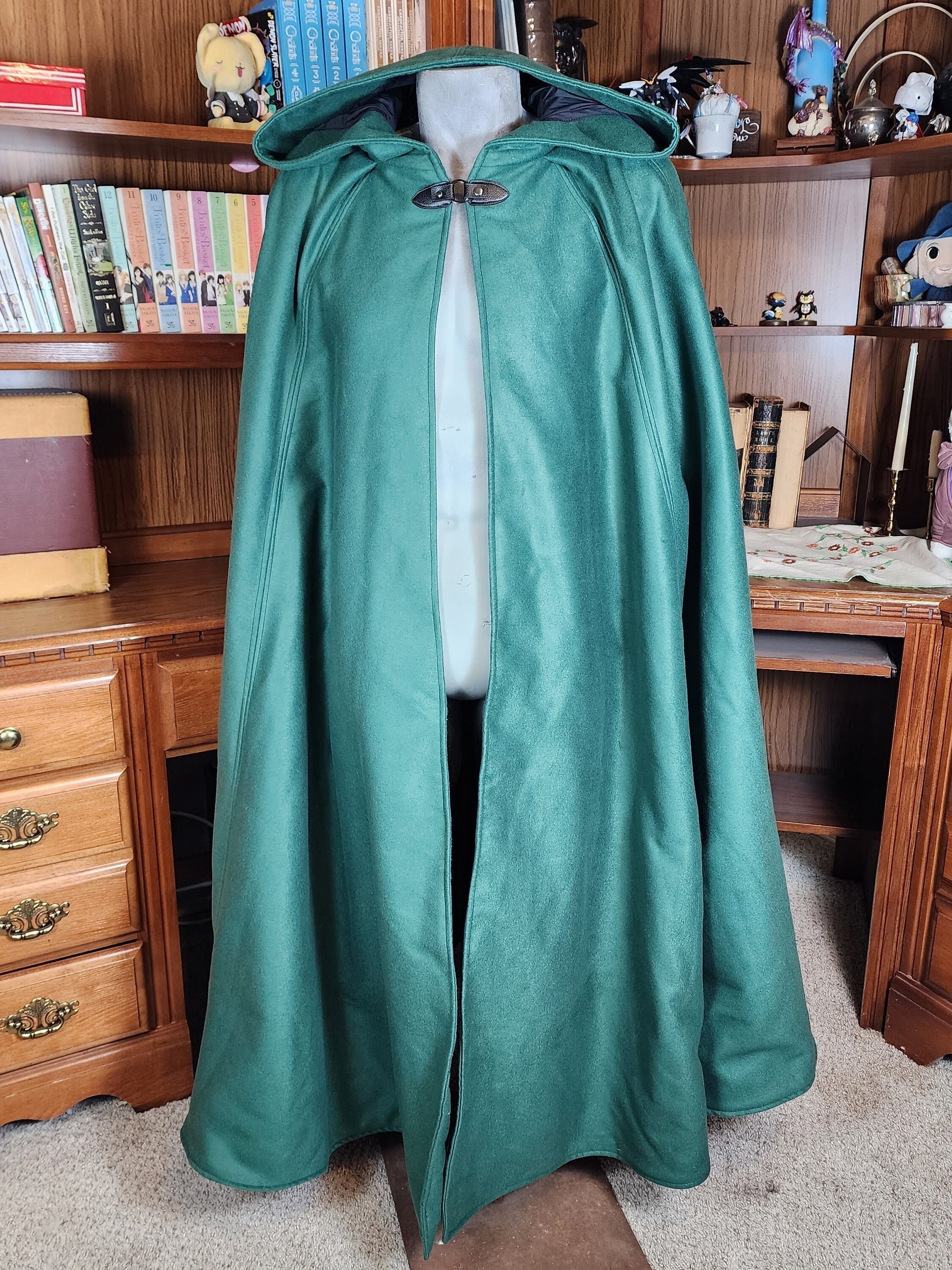 This cloak is made from a polyester and rayon blend medium weight Melton fabric with a water resistant nylon lining. The cloak is faced on all sides with a band of the sturdy Melton fabric to help protect the lining from wear and tear over time. The clasp I've chosen for this cloak is a leather snap style.
