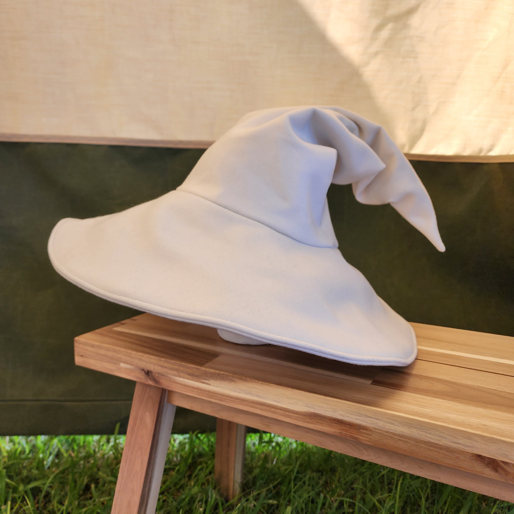 This classic style wizard hat is made from a heavy Polyester and Rayon blend Melton fabric with a silky nylon lining. It has a large sloped brim and a pointed crown.